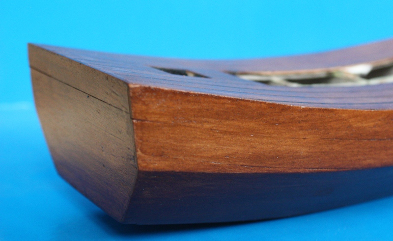 Niestety Radku dżonka nie jest równa. Widać to na poniższych fotkach. Wykonałem już drugi szkielet, ale... szkielet był równy, natomiast poszycie robione trochę inaczej niż pierwsze DO BANI - jest krzywo. Jeszcze trochę poszlifuje i... ewnie wykonam nową... Acha, malowałem już (przed przyklejeniem elemetów z trzech powodów: chcę się nauczyć równo wyznaczać i mocować kołeczki oraz przekonać się jak będzie wyglądać po lakierowaniu "zaszpachlowana" na wikol i pył fornirowy szpara a także zobaczyć jak można wypełnić szpary w pokładzie. To ostatnie nawet fajnie wyszło. Jest zrobione z rozgniecionego węgla do grila. Nie chciałem poczernić całego pokładu, więc pomalowałem lakierem, okleiłem taśmą każdą szparę nałożyłem wikol i wtarłem pył).