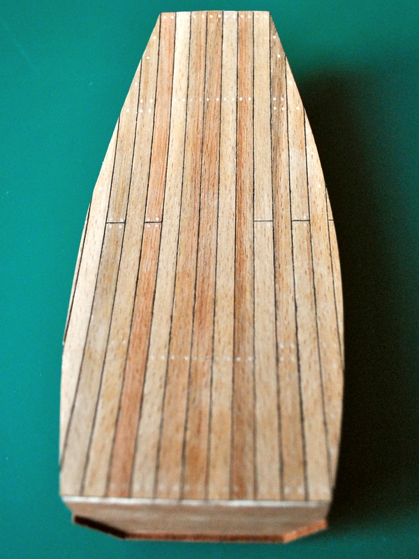 Poćwiczyłem przy okazji robienie treenails z wykałaczek i caulking z nici 0.3mm. Już wiem że te nici co mam są nic nie warte, bo ich grubość nie jest stała, ale jakoś je upchnąłem między klepki pokładu. Nić była nasączona klejem CA i wciskana przy pomocy kawałka listewki bukowej. Przed caulkingiem cyklinowałem pokład ostrzem nożyka do tapet. Klepki są pomieszane odcieniami celowo.