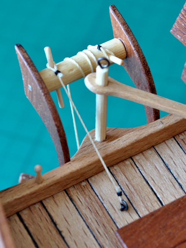 Olinowanie usztywnione rozcieńczonym pattexem wymieniłem bo... zwiędło jakoś. Obecne linki usztywniłem klejem CA. Wiązania na knagach i "słoneczka", kręcone na długopisie, też są zespawane CA. No i to by było chyba na tyle :) Teraz napawam się dumą, że udało mi się ukończyć dżonkę, no i pierwsze koty za płoty ;)