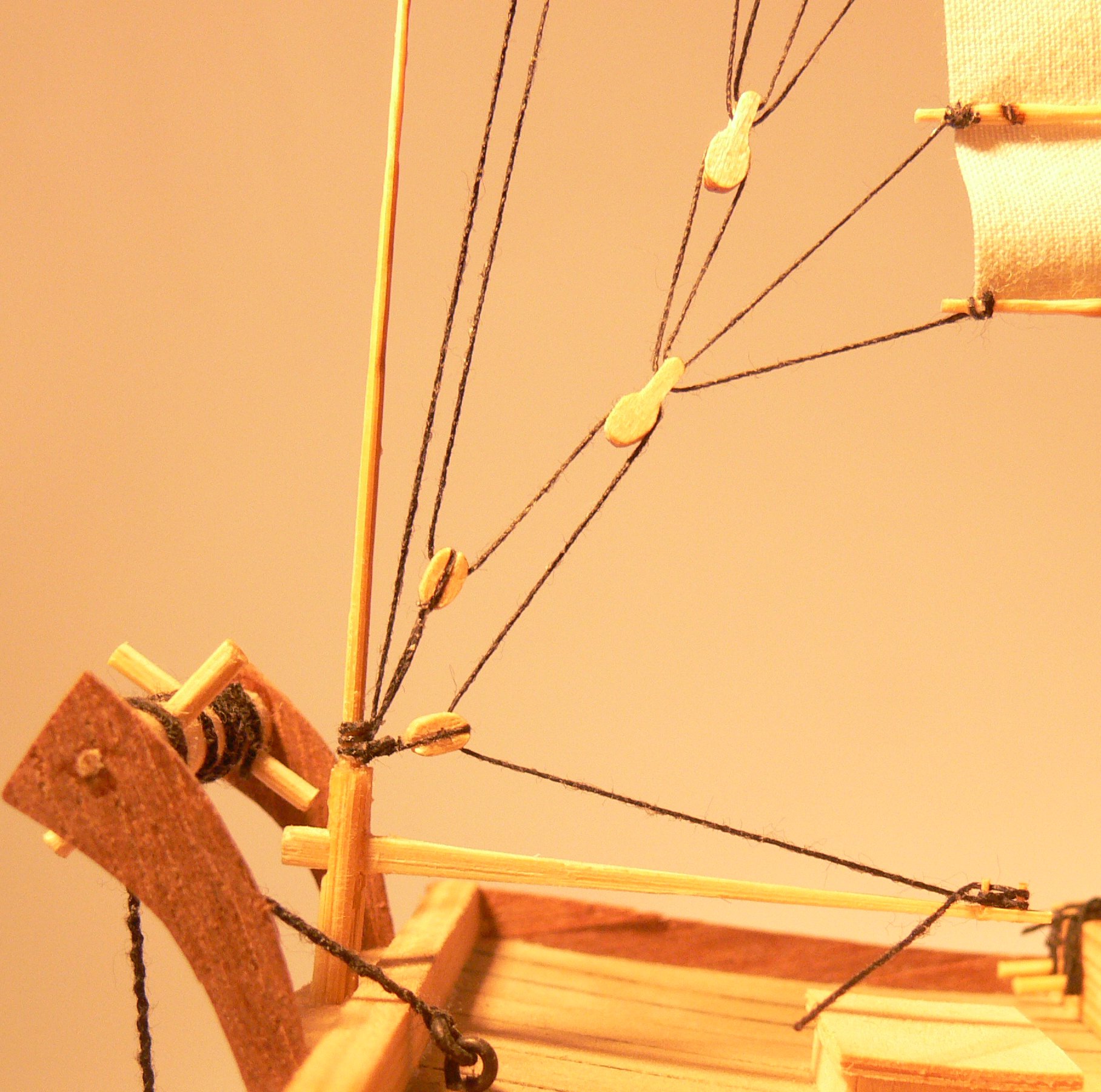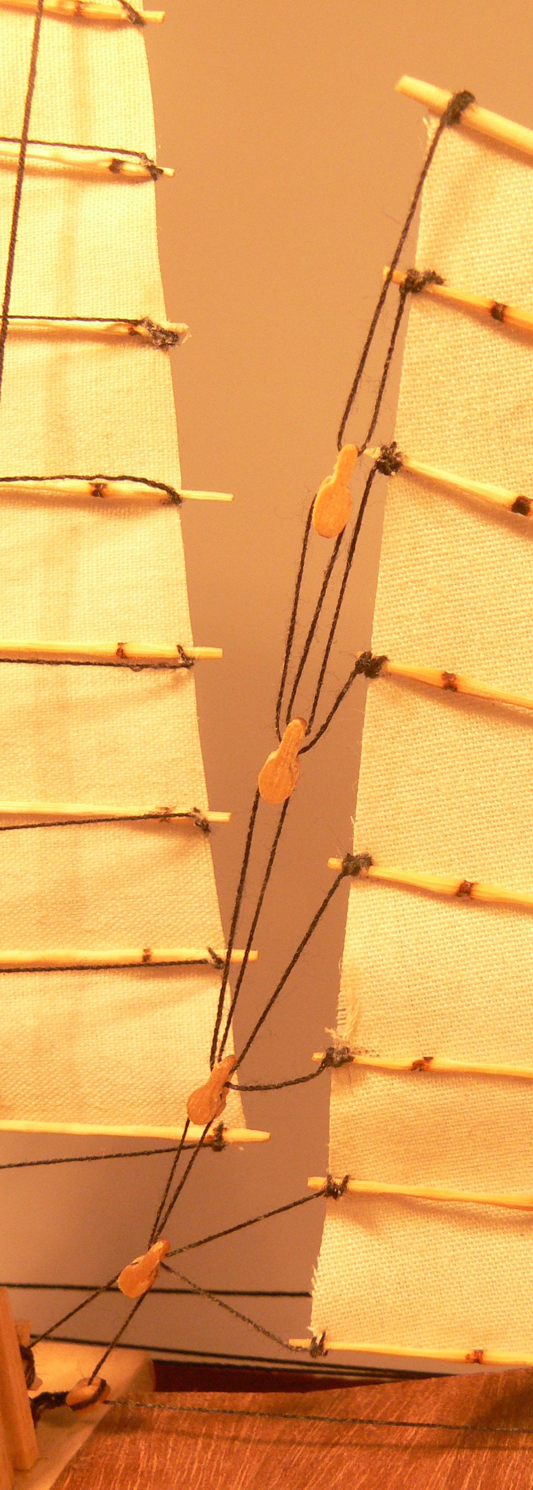 Spokojnie kolego nitki na zdjęciu przechodzące przez bloczek są włożone dla próby liny montowane na dżonce będą pozbawione wszystkich włosków.