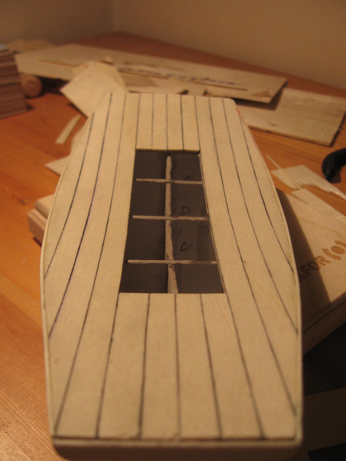Tak jak pisałem w przywitalni zaczynam relację z budowy. Trochę od środka ale niestety wcześniej nie miałem dostępu do aparatu. Szkielet wykonałem z 2 mm tektury, natomiast poszycie z sklejki odzyskanej ze skrzynek po owocach. 3-mm sklejkę rozwarstwiłem i w ten sposób uzyskałem 1-mm grubości paski drewna. Nie wiem czy ten materiał nadaję się idealnie na tego typu prace, ale akurat nic innego nie miałem. Poniżej zdjęcia poszycia:
