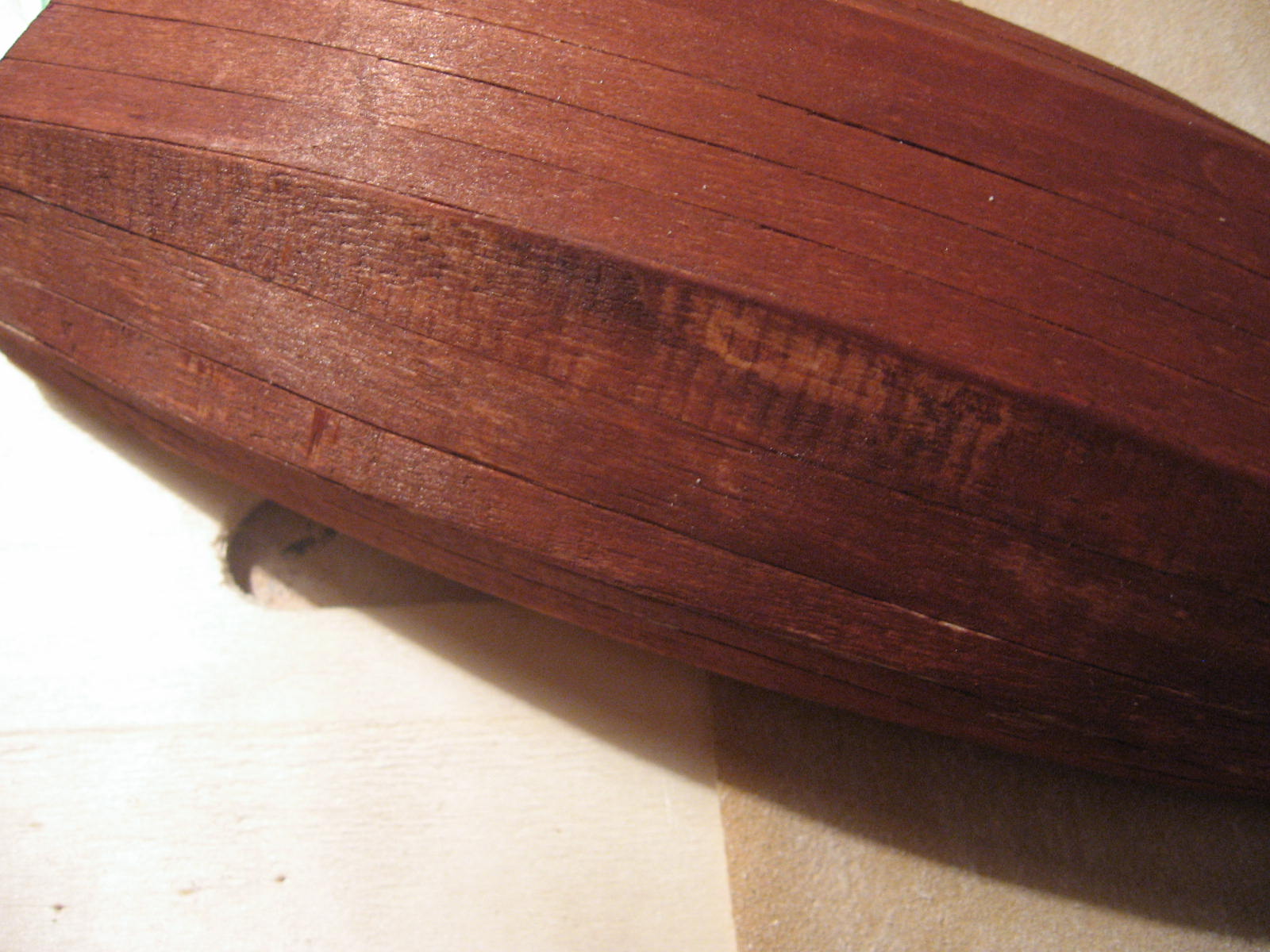 W każdym razie okazało się, że faktycznie "bejca dość głęboko wnika w drewno" . Po części udało mi zeszlifować kadłub, ale ślady starej bejcy pozostały. Jednak w pewnym stopniu udało mi się zeszlifować ślady od ryflowanych wałków o których pisał Hadżi. Dzisiaj wyszlifowany kadłub pomalowałem bejcą "buk". Po wyschnięciu zobaczymy co z tego wyjdzie. Jeżeli będzie słabo, to zawsze mogę wykonać drugie poszycie. Jeżeli chodzi o niedomalowane ślady na pokładzie to faktycznie są to miejsca zalane klejem, ale zbyt mocno się tym nie przejmowałem, ponieważ wzdłuż krawędzi pokładu planuję wklejenie listwy (burty) która i tak zakryje te miejsca. W tym celu robiłem pierwsze próby gięcia listewki 3x4 mm. Muszę przyznać, że byłym zaskoczony efektem. Listewka faktycznie się wygięła i nie pękła