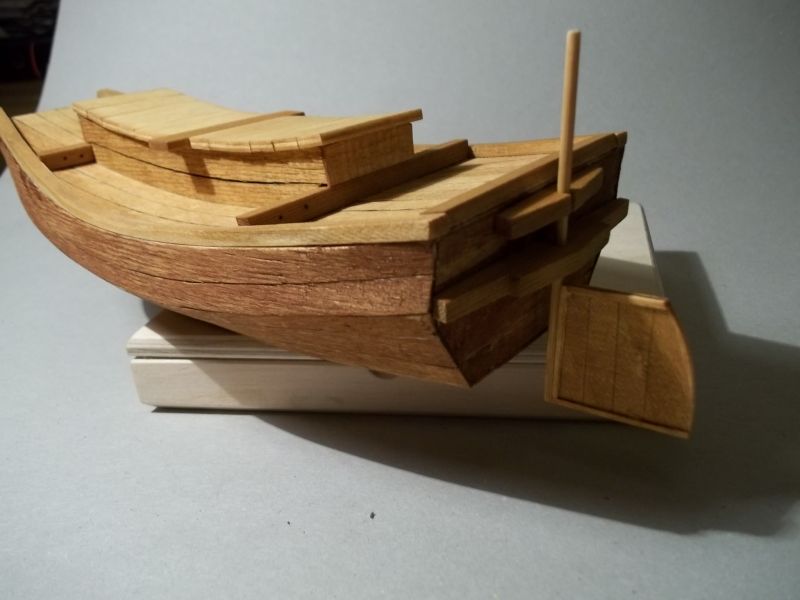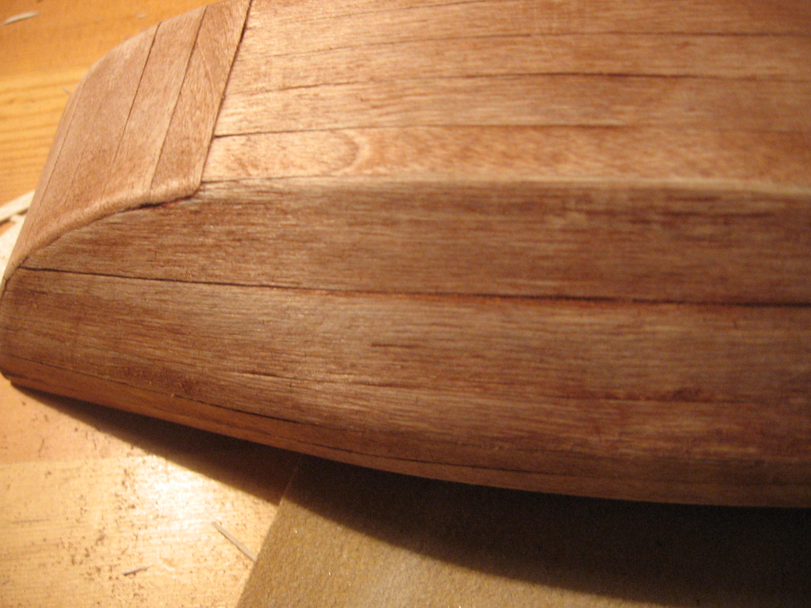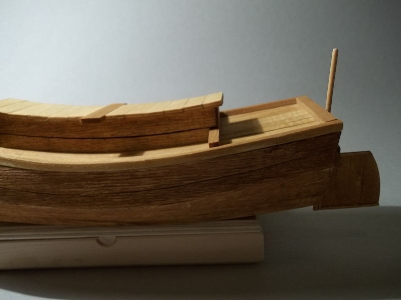 Do poszycia kadłuba użyłeś materiału ze skrzyneczek. Źle jednak dobrałeś strony tz. na jednej stronie widoczne są poprzeczne równomiernie rozmieszczone wgłębienia. Pochodzą one od ryflowanych wałków posuwu w maszynie. Występują one na jednej stronie listewek. Te miejsca zaznaczyłem pomarańczowymi strzałkami na zdjeciu pokładu.Występują one również na jednej burcie Twojej dżonki. Można to było wyeliminować przyklejając listewki tą stroną do wewnątrz. A jeżeli się to przeoczyło, to poprzez szlifowanie, aż do zaniku tych wgnieceń. Tak jak już przedmówcy napisali, szlifowanie zabejcowanej powierzchni i ponowne jej bejcowanie nic nie poprawi, a wręcz pogorszy. Na pokładzie czarnymi strzałkami zaznaczyłem miejsca niedobejcowane. Dzieje się to tak jak nadmiar kleju wsiąknie w drewno. W tym miejscu drewno bejcy nie przyjmuje nawet po przeszlifowaniu. Ja na Twoim miejscu, na tym samym poszyciu wykleiłbym drugą warstwę poszycia kadłuba i pokładu.Pogrubi, to co prawda kadłub i pokład ale nieznacznie. Wcześniej te cienkie listewki pomalował bym odpowiednią bejcą.Cienkie drewno zmoczone jednostronnie ma tendencję do wypaczania się podczas wysychania. Dlatego po zabejcowaniu listwy należ ułożyć na równym podłożu i przycisnąć równą sztywną płytą, deską, taflą grubego szkła itp. Takie przyciśnięcie dodatkowo trzeba dociążyć np. stosem ksiażek i pozostawić na pare dni do wyschnięcia. Wyschnięte takie listwy czy fornir można pociąć na wąskie listwy poszycia. Po cięciu uwidocznią się jaśniejsze krawędzie. Te krawędzie można zamalować tą samą bejcą i one będą ciemniejsze od zewnętrznej powierzchni, co po sklejeniu do siebie dadzą ciemniejszą linię. Można też zamalować je miękkim ołówkiem, co będzie imitować uszczelnienie między deskami.