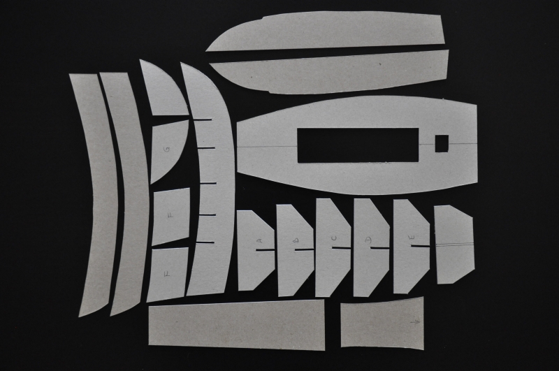Szkielet nakleiłem na tekturę 1,5 mm, poszycie – tektura 1 mm. Nie wycinam poszczególnych elementów tylko naklejam całe arkusze wycinanki na tekturę. Klej naniesiony jest na spodniej stronie w taki sposób, aby nie pokrywał elementów szkieletu. Po wycięciu nożykiem fajnie wypadają poszczególne części.