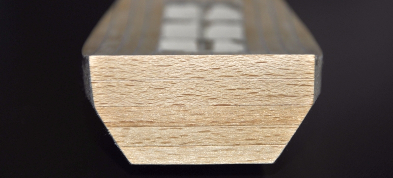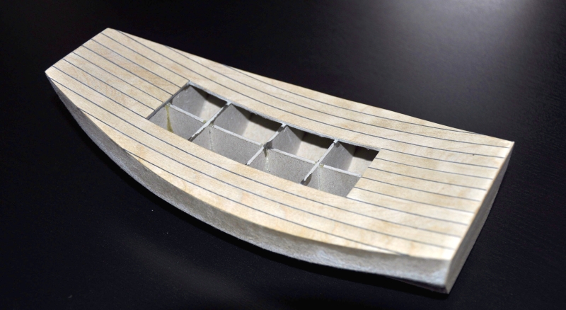 Pierwsze cięcie forniru (brzoza) na pokład. Fornir tnę na 8 mm deski. Do wypełnienia szczelin pomiędzy deskami pokładu przygotowałem 1,5 mm paski czarnego brystolu.