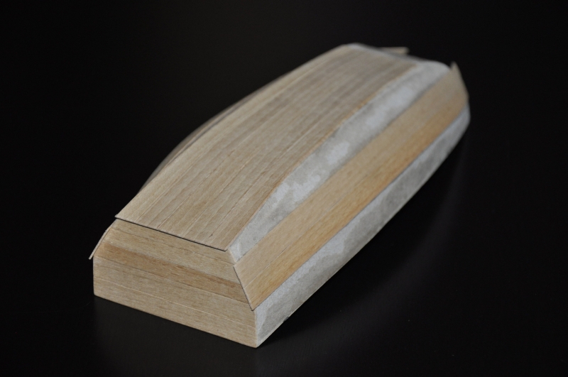 Poszywanie w toku. Fornir 0,6 mm buk. Dno oklejone, teraz kolej na burty.