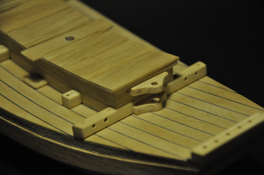 Wszystkie elementy zostały przyklejone klejem Kropelka. Belki przewiercone wiertłem Ø 1,5 mm. W otwory wkleiłem Kropelką wykałaczki (przechodzą na wylot i wchodzą w otwory wywiercone w pokładzie).