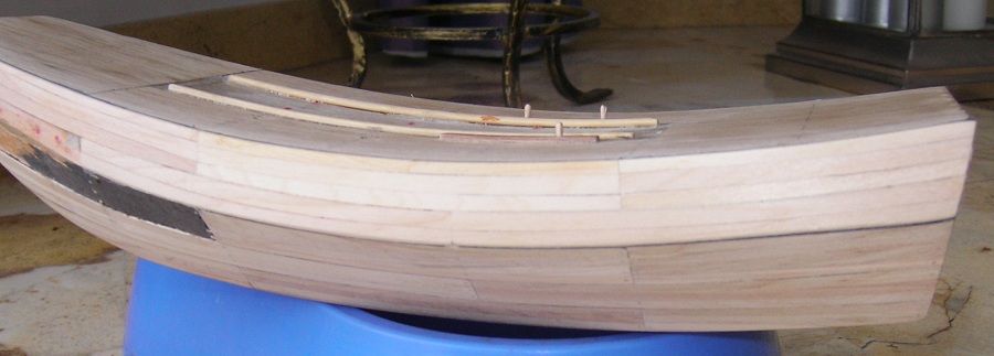 Witam po przerwie , spowodowanej częściowo obowiązkami zawodowymi, częściowo przyjemnościami na wysokościach . W temacie modelu : ćwiczenia z wyginania listewek (wyginanie na mokro i „przypiekanie” żelazkiem). Naklejone na karton po 3 szt. (szerokość mojej deski) Klejenie poszycia przy pomocy kleju butapren –praca z nim bardziej mi się podoba niż z pattex expres Niestety nie obyło się bez niespodzianek. Musiałem wymienić jedną „deskę” na dziobie – zbyt zapalczywie szlifowałem i … doszlifowałem się do czarnego papieru