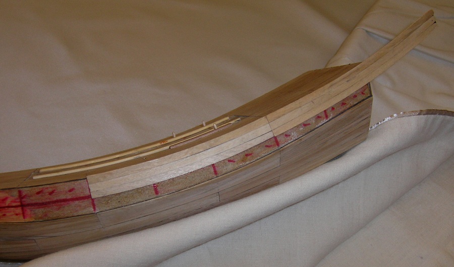 Niestety nie obyło się bez niespodzianek. Musiałem wymienić jedną „deskę” na dziobie – zbyt zapalczywie szlifowałem i … doszlifowałem się do czarnego papieru