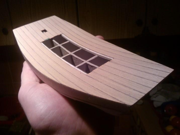 szkielet z tektury grubość 2mm poszyty tekturką 1mm . pokład - fornir dębowy, planki poszycia fornir orzech. ( tylko takie miałem )