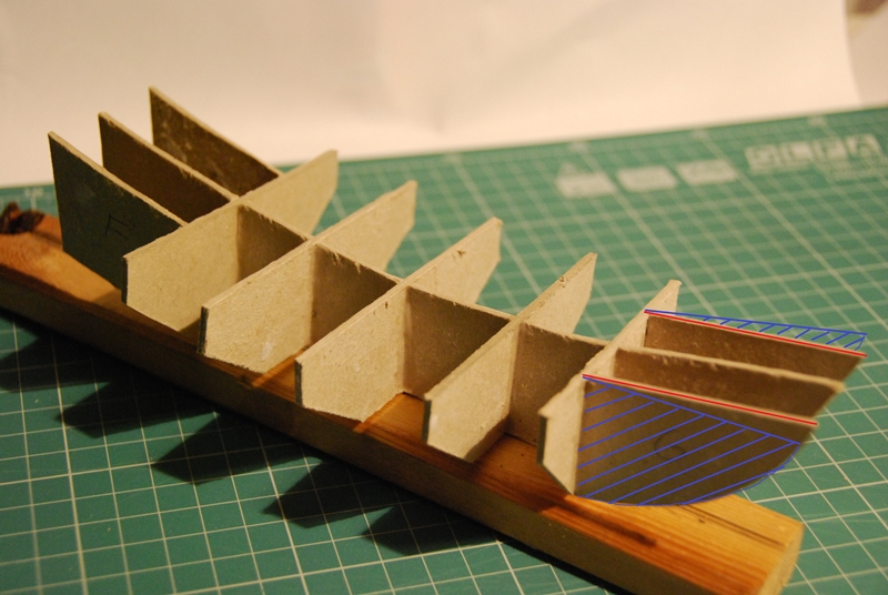Widać już charakterystyczne dżonkowe "ości". I jak zaznaczyłem na zdjęciu już pierwszy, na szczęście niewielki błąd. Przykleiłem prostopadle wzmocnienia kadłuba podtrzymujące dziób , zamiast skierować je lekko ukośnie w bok. Utrudniło mi to później przyklejanie burt i spodu kadłuba - musiałem wkleić w te miejsca kawałki grubej tektury, żeby mieć powierzchnię do której mógłbym się "dokleić". Tak to jest, jak się człowiek śpieszy żeby ujrzeć wreszcie bryłę kadłuba.