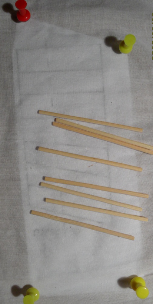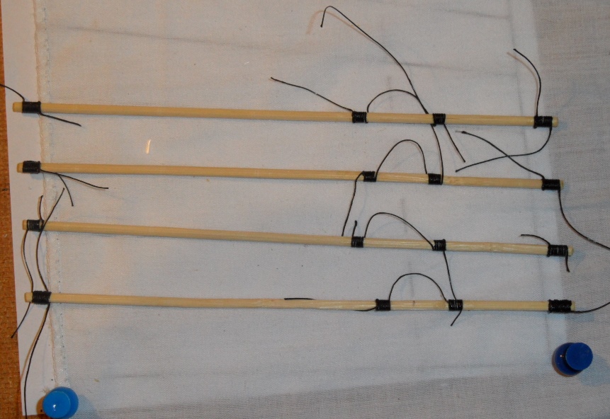 Części drewniane żagli wykonane z bambusowych patyczków. Oplot ze zwykłej czarnej nici, wszystko klejone klejem CA. Widoczna na zdjęciu cienka bawełna - nie będzie docelowym materiałem na żagiel - nie pasuje do całokształtu łódeczki.