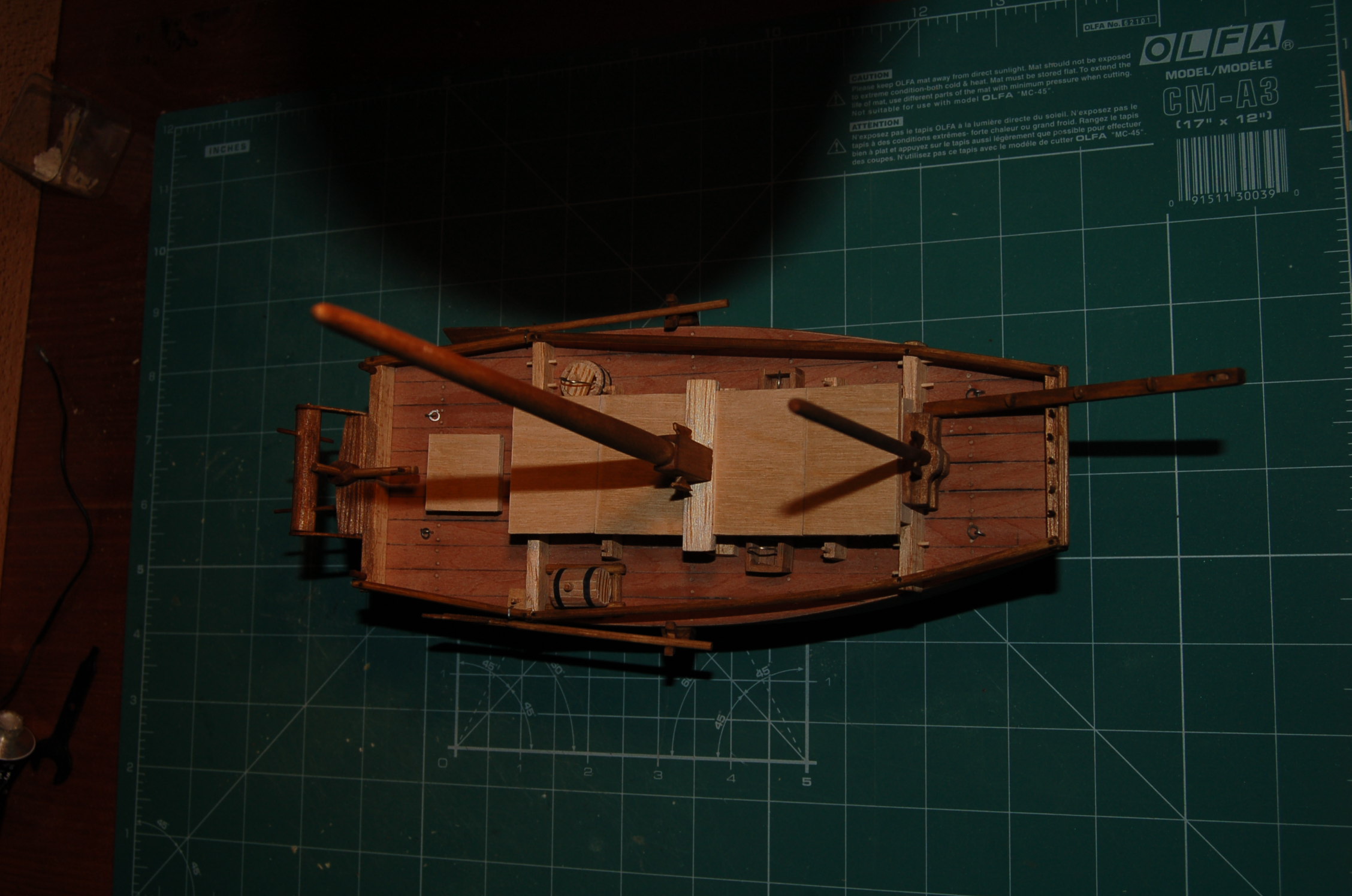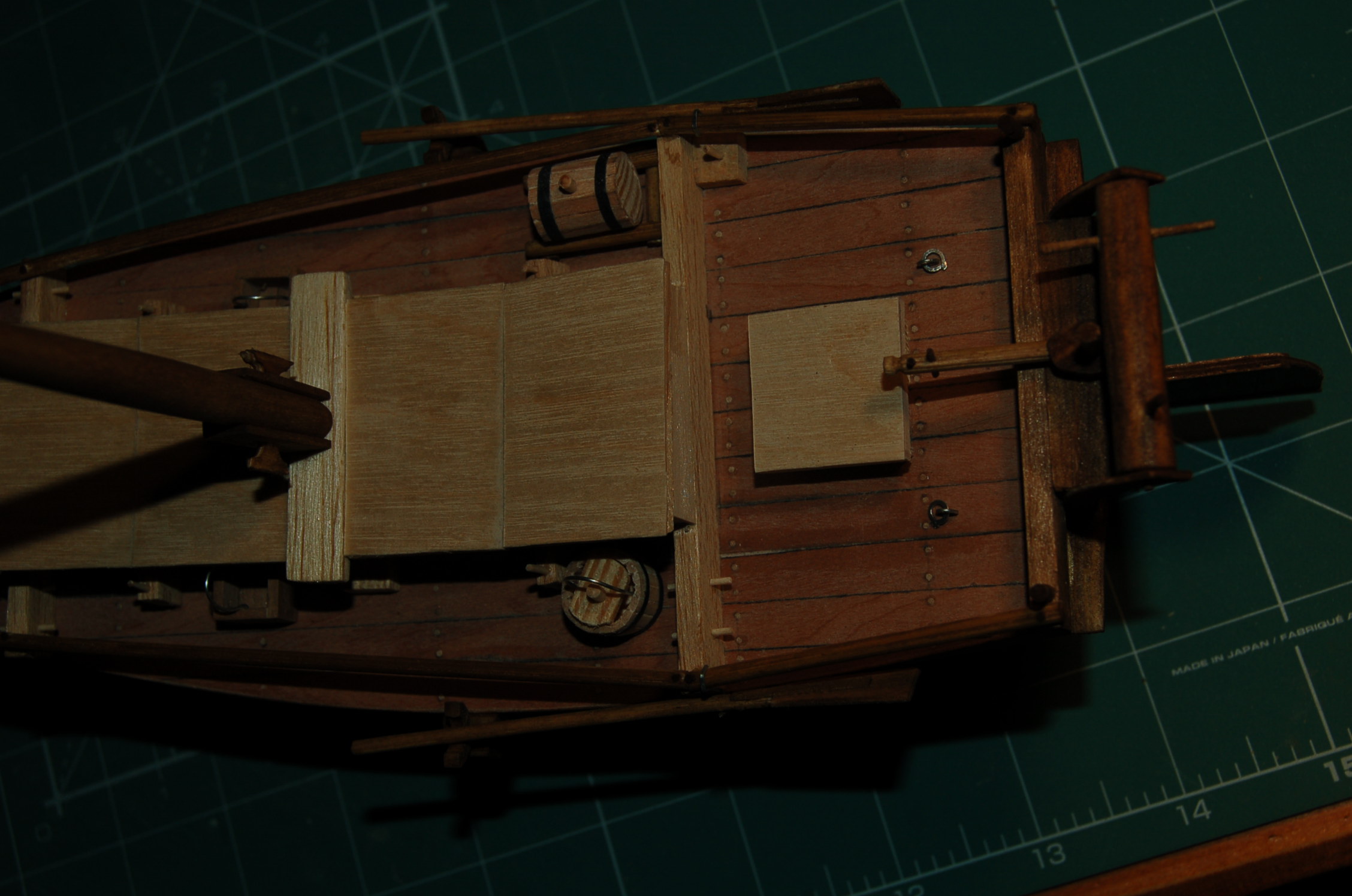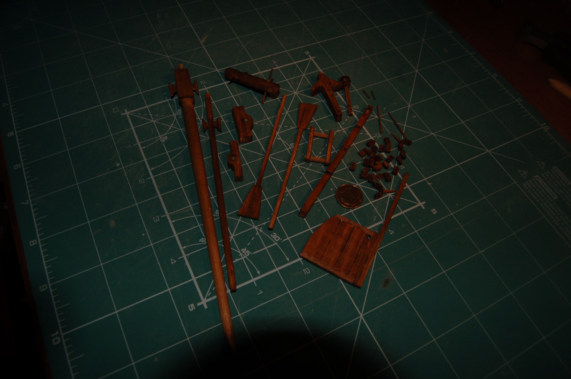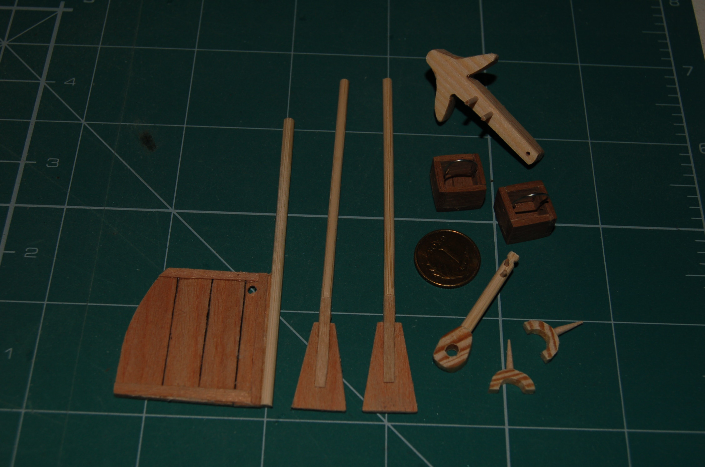 Powstały, beczka z podstawką (dna ścięte z wałka i pokryte klepkami z forniru, korek to końcówka ściętej wykałaczki), wiaderka kwadratowe i okrągłe, dno i pokrywka jak w beczce i reszta ze ściętych i wyszlifowanych wykałaczek. Rączki są z drutu. Następnie wystrugałem nożykiem i wyszlifowałem pilnikami knagi przy masztach oraz wykonałem dulki do wioseł. Wszystko przedstawia zdjęcie.