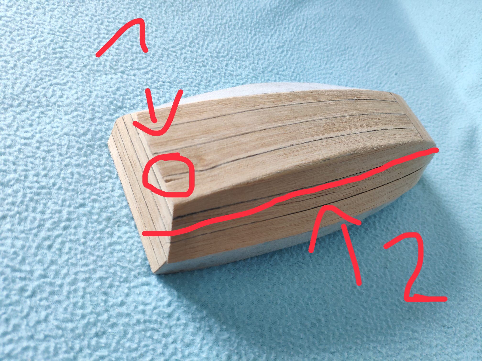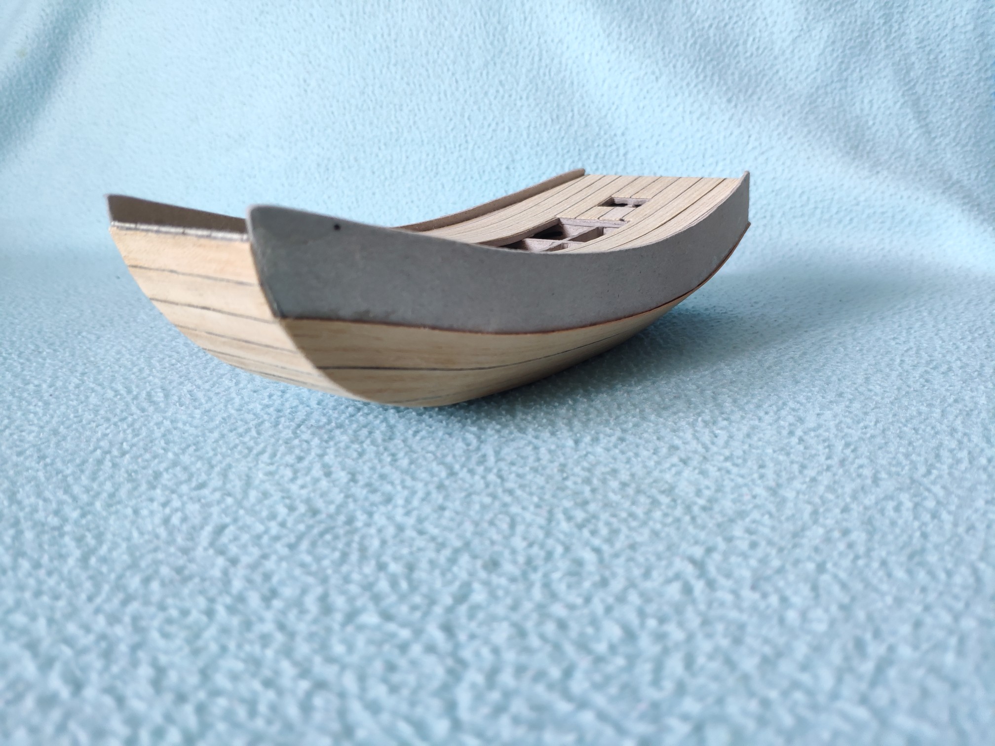 Myślę, że nie będzie zbyt drastyczne zerwanie całości i naklejenie nowego pokładu. Proponuję zrobić go jako osobny komponent i dopiero nakleić na model. Na tekturze 0,5 odrysuj z planu kształt i oklej fornirem z naddatkami na dł i szer. Możesz to zeskrobać do równej powierzchni i przeszlifować ( do czernienia krawędzi proponuję zmieszać czarny tusz z patexem lub czymś wikolowatym, bo np marker brudzi). Póżniej jeszcze raz taki szablon odrusuj na pokładzie z zachowaniem symetrii otworów do wycięcia i zewnętrznego obrysu. Całość przyklejasz do szkieletu i gotowe ( w zasadzie najlepiej to zrobić jeszcze przed przyklejeniem burt ale tu już zrobiłeś to wcześniej wieć pozostanie wpasowanie pomiędzy). Sposób jest dużo szybszy i dokładniejszy. Przygotowanie takiej formatki to kwestia może jednej godziny.
