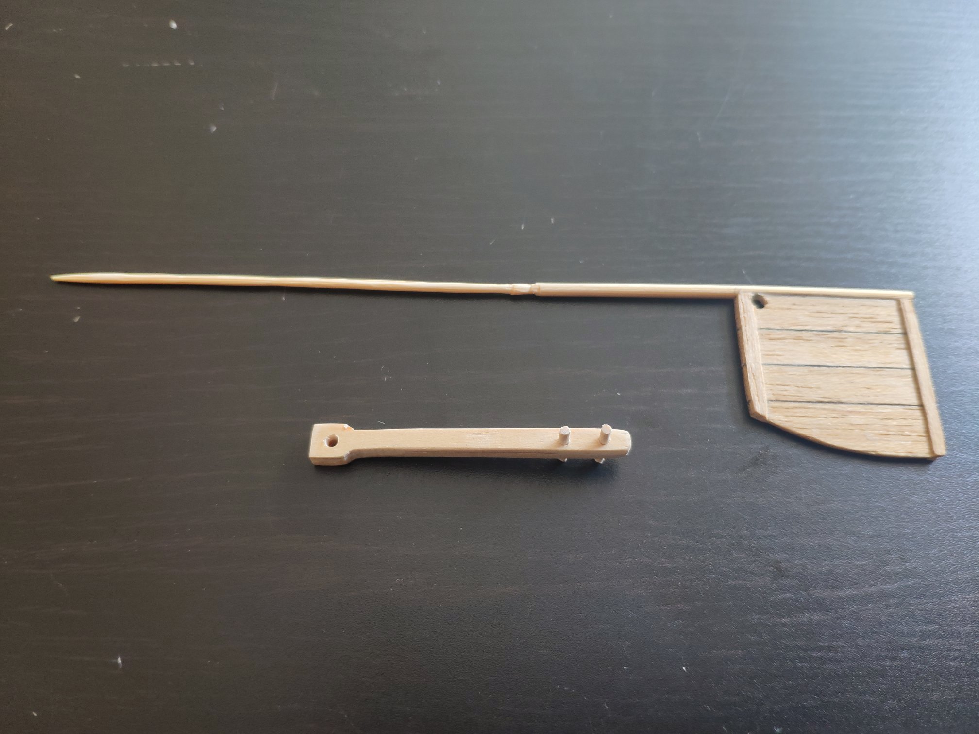 Dzisiaj bukszpryt z patyczków po lodach :-) ale ciągle nie wiem jakiej grubości linę ? Do kotwicy chyba grubsza niż do żagli ?