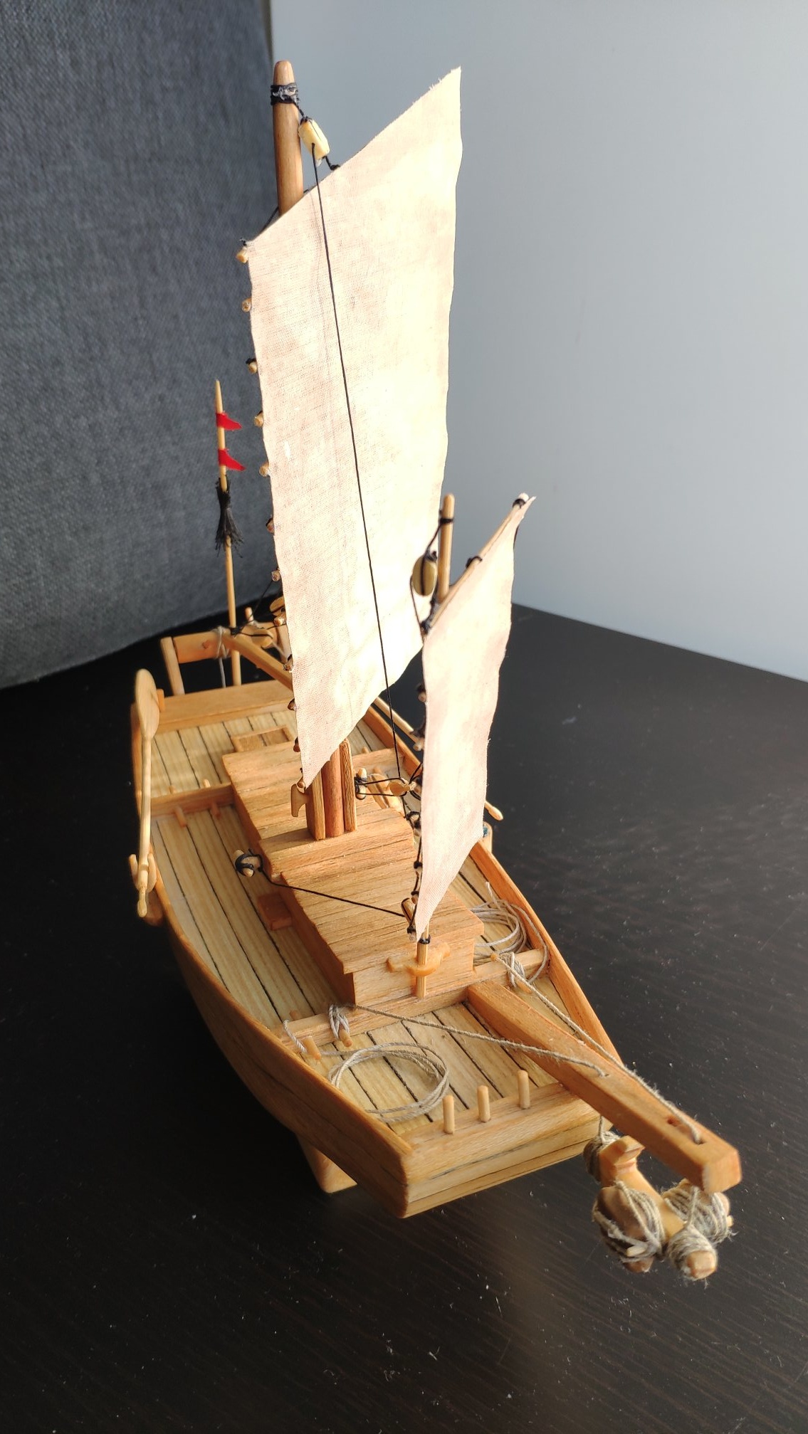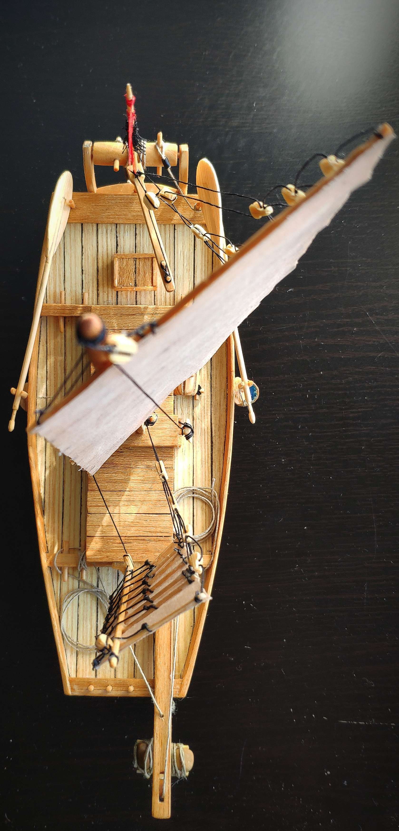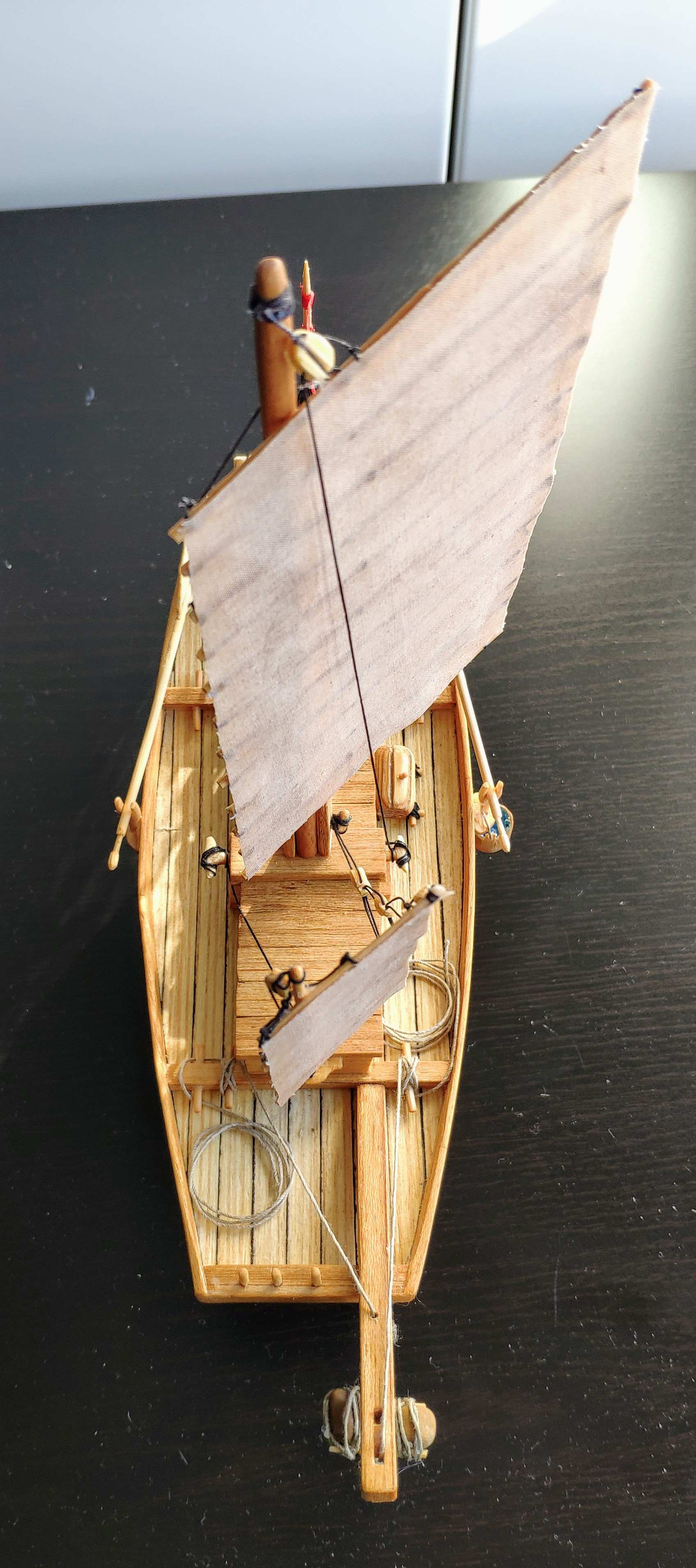 Średnio mi się to podoba i chciałbym zrobić bardziej "europejsko" ... no może nie prostopadle do burt ale chociaż 45 % do burt, tylko czy to będzie zgodne z prawdą ? Myślałem by patyczki w żaglu przykleić do masztów by utrzymać taki skos przy naciągniętych linkach.