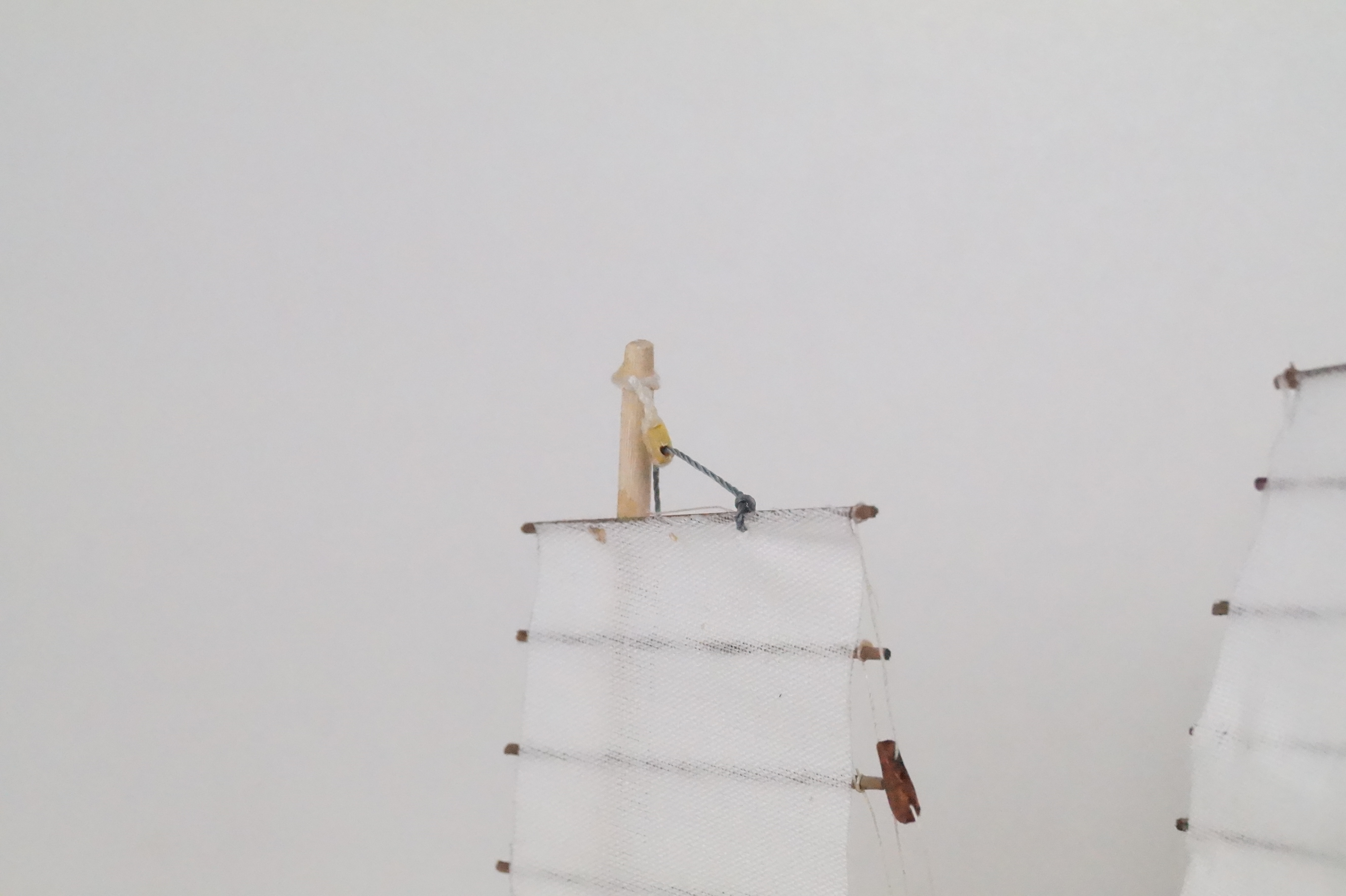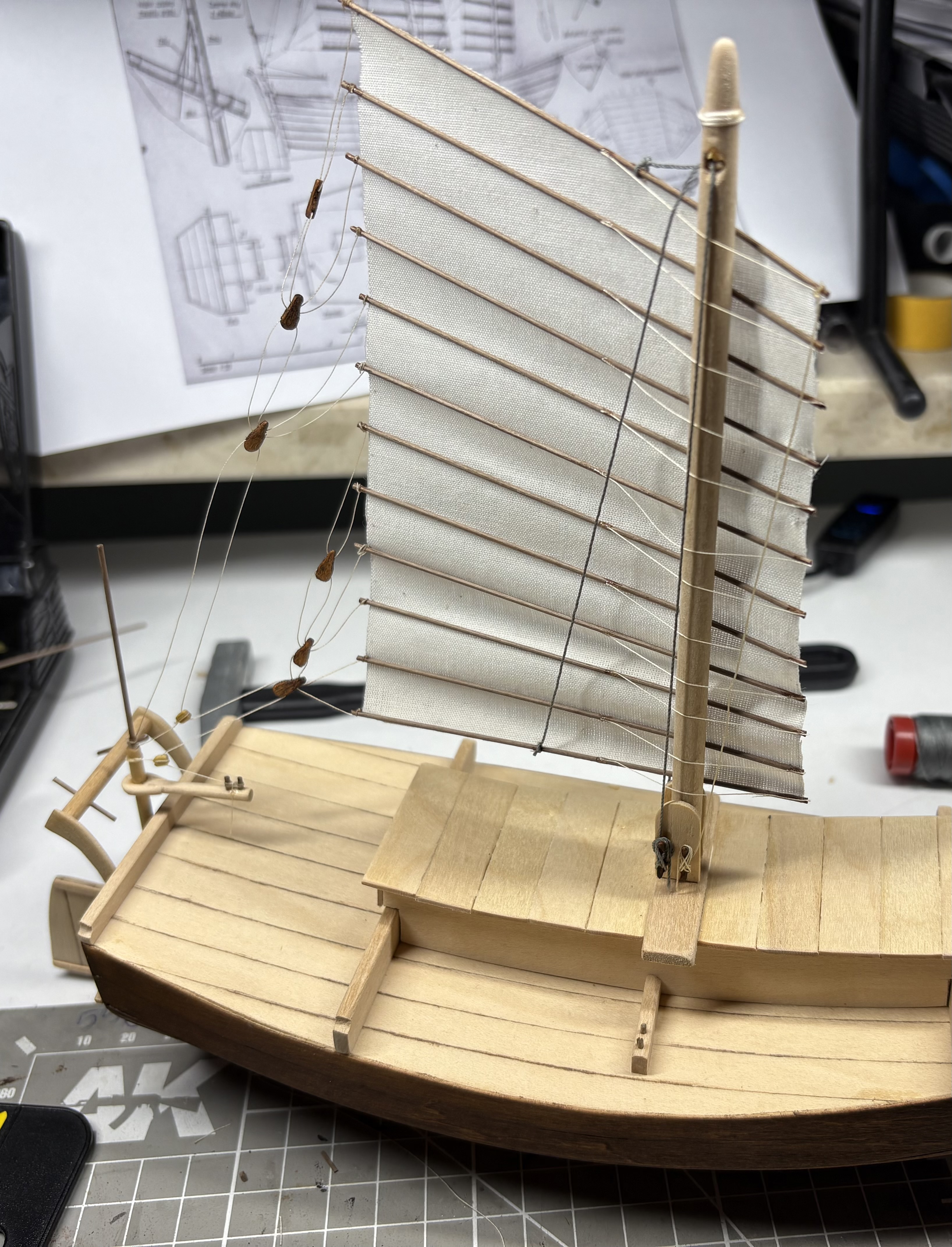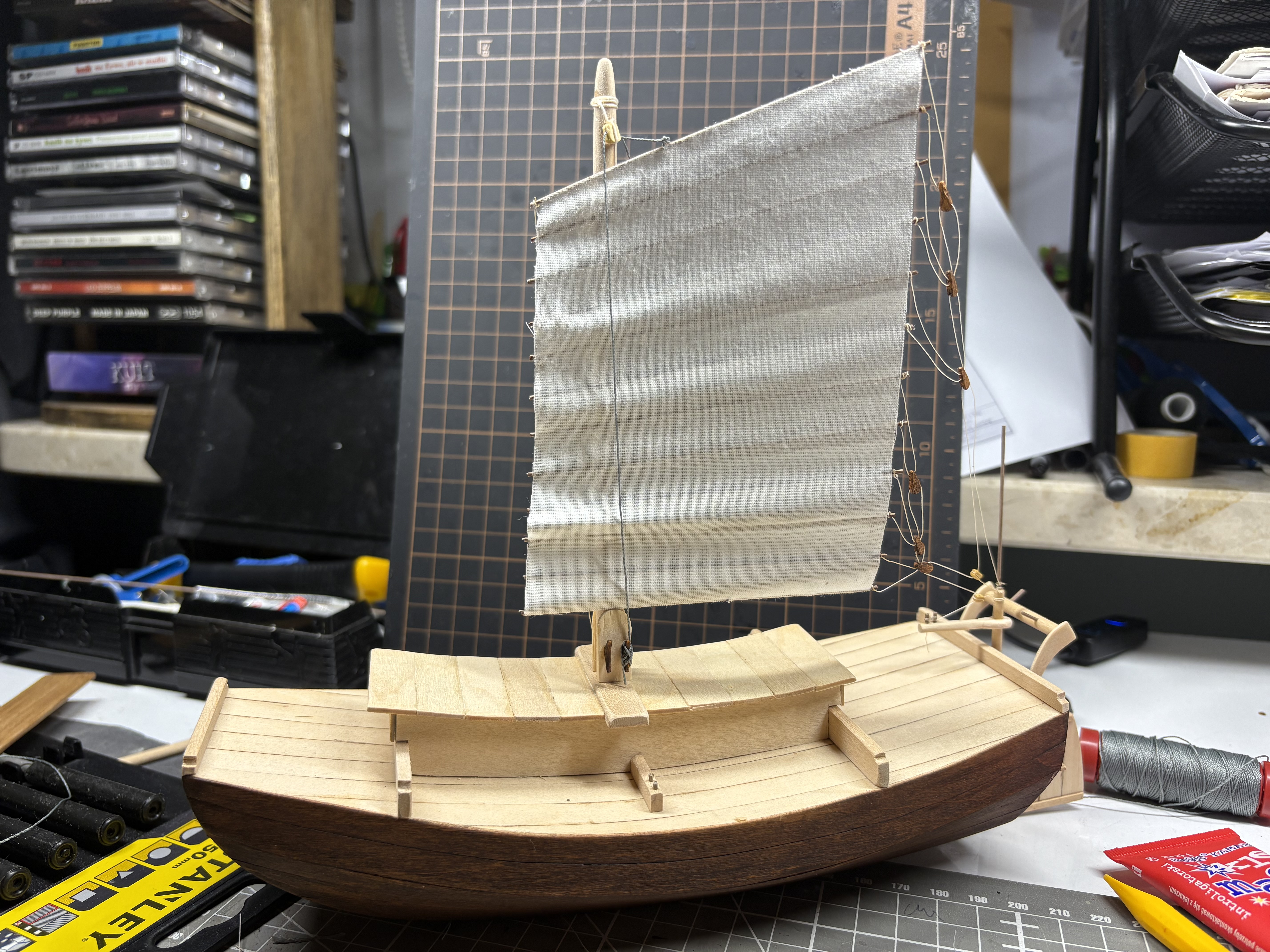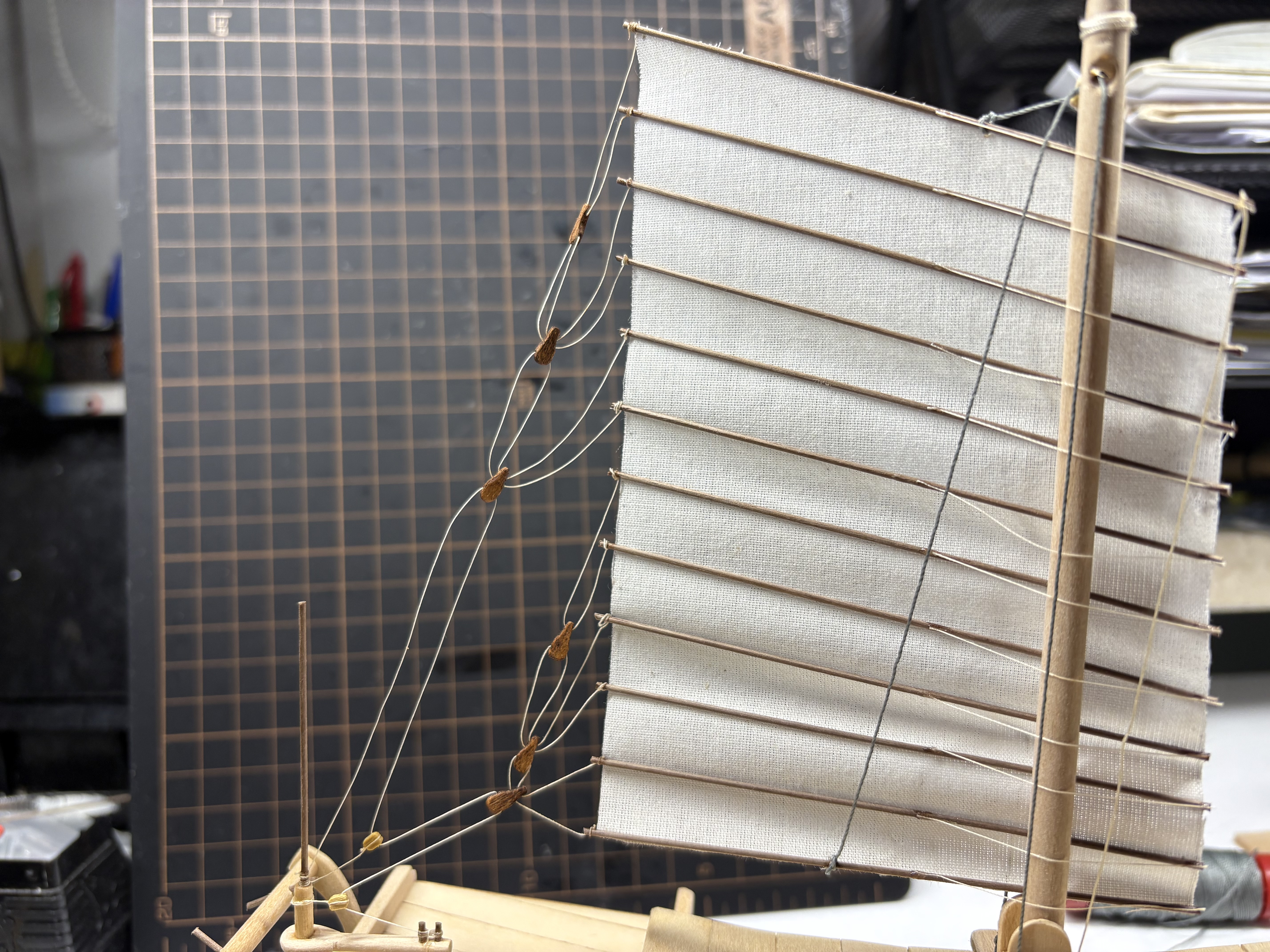 Dżonka nabiera kształtu, w końcu trzeba było zawiesić pierwszy żagiel. Knagi zrobione własnoręcznie, kilka prób, ale w końcu się udało. Nie są doskonałe, wiem, ale są