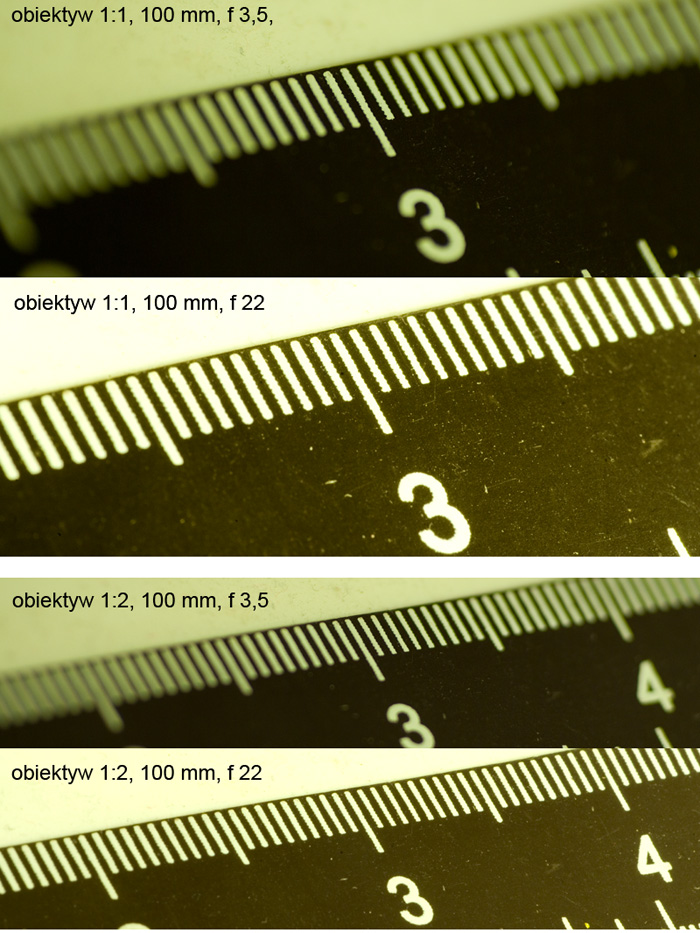 Oto poglądowe zdjęcia zrobione tak, że motyw (linijka i rząd szpilek) ustawione były pod kątem 45 stopni do obiektywu ( w środku obiektywu była 3, 2 bliżej, 4 dalej-ostrzone na 3,)