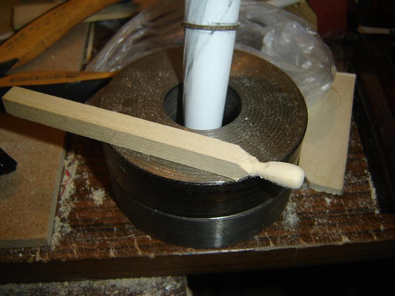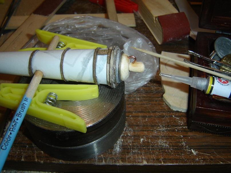 Witam Jako że nie mam dostępu do tokarki , ani tym podobnego narzędzia postanowiłem spróbować wykonać działo z " niczego" Wyszło jak wyszło , ale zważywszy na materiał z którego zostało wykonane jest ok. Z dwóch kartek od drukarki skleiłem rulonik potem obciąłem nakleiłem paski kartonu . Z tyłu nakleiłem krążek kartonowy potem na niego dwie stare monety o różnej średnicy a na to wszystko krążek z lipy wyprofilowany i gałka również z lipy no i oczywiście drucik miedziany jako ucho. Wszystko klejone CA i pomalowane czarnym matem do metalu. Lufa ma długość ok 14,5 cm i średnice w najszerszym miejscu ok 2,8 cm Efekt końcowy poniżej.