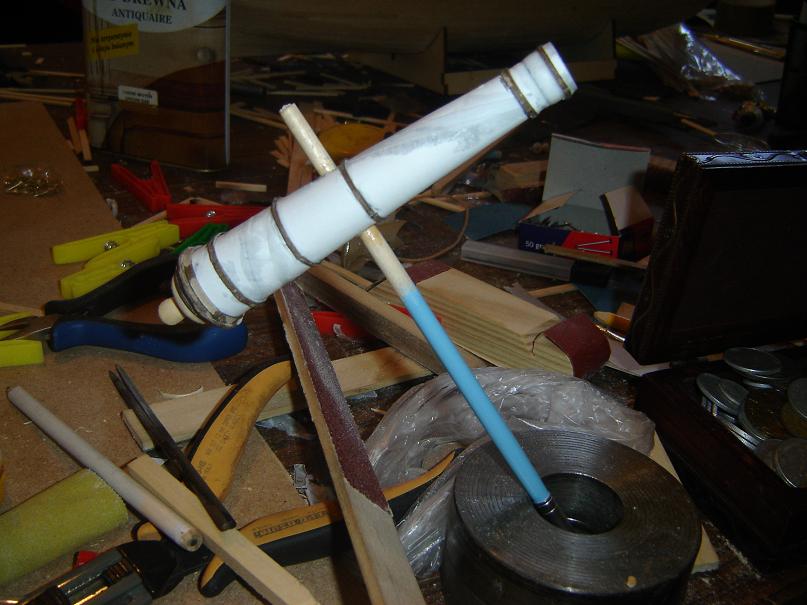 Witam Jako że nie mam dostępu do tokarki , ani tym podobnego narzędzia postanowiłem spróbować wykonać działo z " niczego" Wyszło jak wyszło , ale zważywszy na materiał z którego zostało wykonane jest ok. Z dwóch kartek od drukarki skleiłem rulonik potem obciąłem nakleiłem paski kartonu . Z tyłu nakleiłem krążek kartonowy potem na niego dwie stare monety o różnej średnicy a na to wszystko krążek z lipy wyprofilowany i gałka również z lipy no i oczywiście drucik miedziany jako ucho. Wszystko klejone CA i pomalowane czarnym matem do metalu. Lufa ma długość ok 14,5 cm i średnice w najszerszym miejscu ok 2,8 cm Efekt końcowy poniżej.