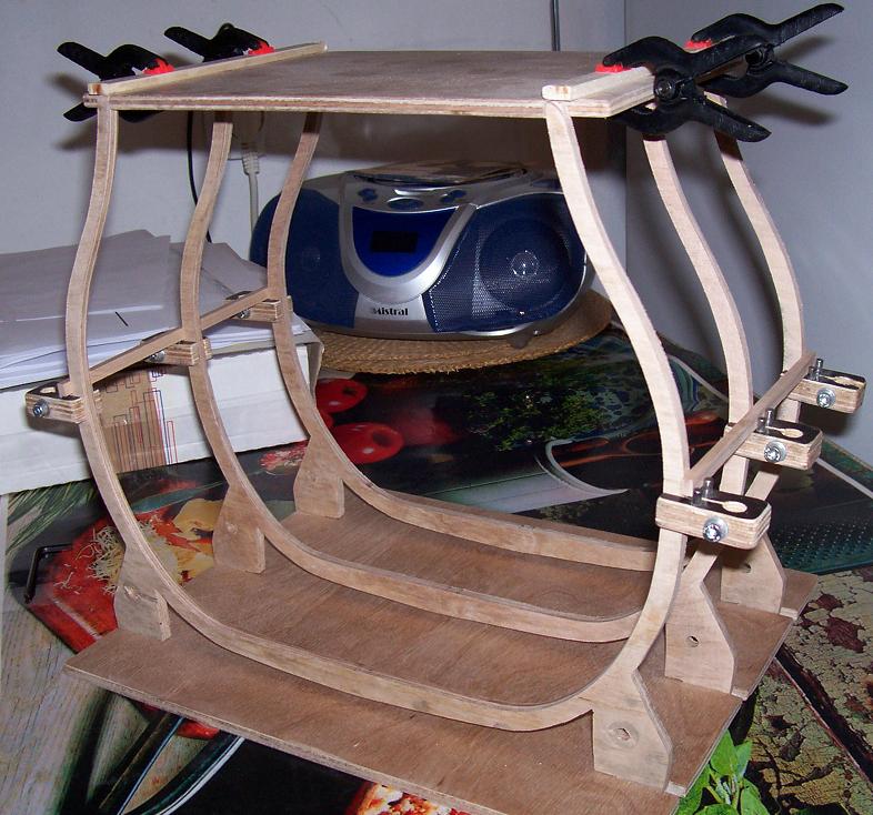 Z uwagi że nowe zdjęcie niewiele się różni od wcześniejszego, ale jednak jest lepsze, pozwoliłem sobie stare wymienić na to poniżej. Mirek słusznie zwrócił mi uwagę że do montażu poszycia będę potrzebował takich sprytnych zacisków, wiec w przerwie pomiędzy molestowaniem wręg wykonałem coś zbliżonego do tych umieszczonych na forum. Problem obracających się śrubek kontrujących rozwiązałem poprzez wpuszczenie nakrętek w sklejkę. Nawierciłem otworki na głębokość równą grubości nakrętki i średnicy równej szerokości nakrętki mierzonej po ściankach, przy mocnym skręceniu nakrętka wcięła się rogami w sklejkę jednocześnie "wciągając" się w podebranie. Teraz swobodnie można skręcić zacisk jedną ręką, nakrętka siedzi mocno wbita w sklejkę i się nie obraca. Wykonałem trzy zaciski prawe i trzy lewe, bolce to wałeczki z rozwalonego łożyska igiełkowego.
