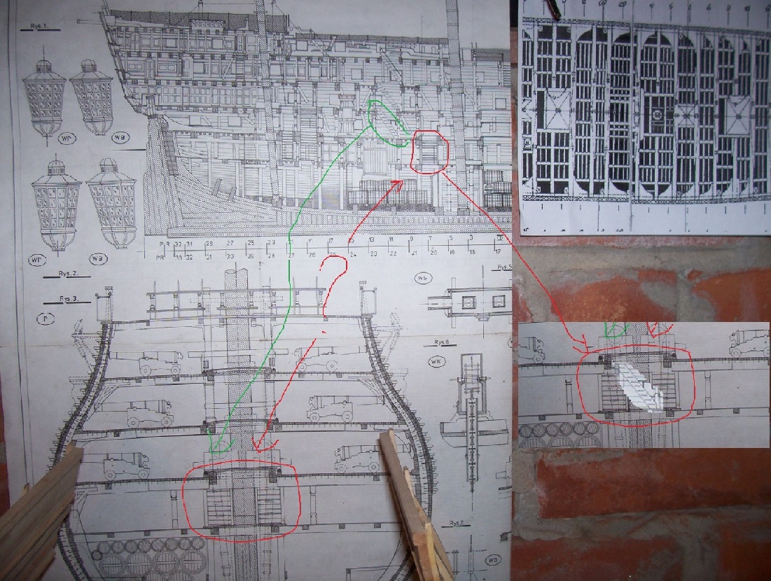 Zgadzam sie z Artkiem - to co zaznaczyłeś w czerwonym owalu, to nie schodnia na dolnym pokładzie bateryjnym, a jakaś inna struktura na niższym odeń pokładzie, zwanym orlop deck. Na zielono zaznaczyłeś prawidłowo w/w schodnię na lower deck'u.