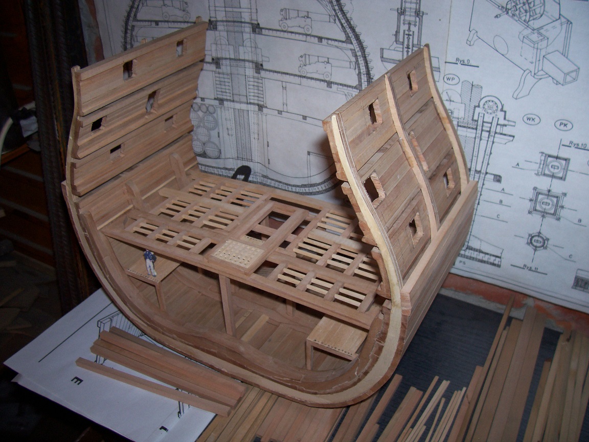 Prace po kawałku do przodu, przekrój odcięty od "pępowin" stoczni, wręgi pocienione, teraz pokrywają się z planem generalnym. Cały czas pochodzą planki poszycia zewnętrznego, w międzyczasie zająłem się wnętrzem kadłuba i konstruuję pierwszy pokład. I tu mi wyszedł na jaw babol, gdzieś się pomyliłem w obliczeniach i pozostawione otwory do montażu dolnego pokładu są za wysoko, co za tym idzie za wysoko są też wewnętrzne wręgi. Uniemożliwia mi to zamontowanie pokładników w przeznaczonych im miejscach,aby nie rujnować prawie wszystkiego, zamontowałem je lekko przesunięte i obniżone, nie są też "wpuszczone" a przyklejone do czoła. Cały pokład będzie odeskowany, nie będzie widać tego błędu.