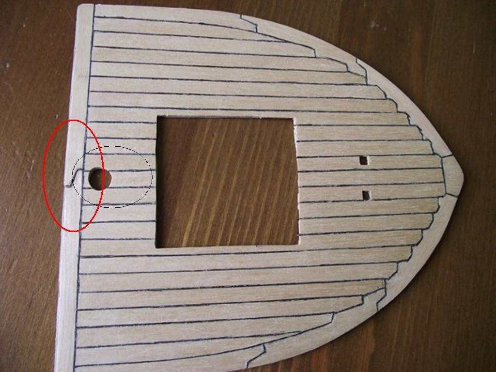 Pokład zrobiony z litego kartonu oklejony fornirem bukowym 0,6mm ( fornir naklejałem na papier ze względu na szczypanie się go podczas cięcia ) uszczelnienie między deskami wykonałem z nitki ,może nie jest idealnie ale mi dostarczył wiele przyjemności