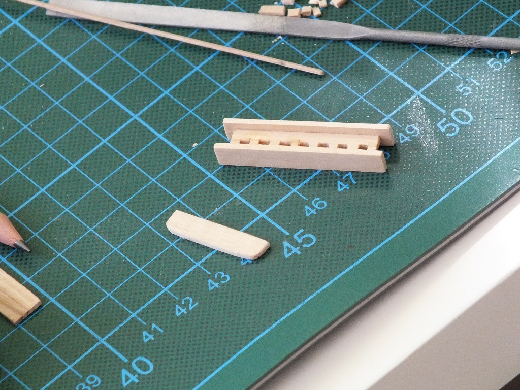 Z tektury grubości 1,2 mm wykonałem większość kołkownic. Wg planów wszystkie mocowane do wewnętrznych części burt. Z zaimpregnowanej tektury, po przeliczeniu i narysowaniu kształtów wyciąłem wszystkie niezbędne elementy. Krawędzie i niedokładności zeszlifowałem papierem ściernym (120 grad). Przed przyklejeniem pomalowałem elementy farbami akrylowymi. Nagielbanki jeszcze nie mają otworów na kołki.