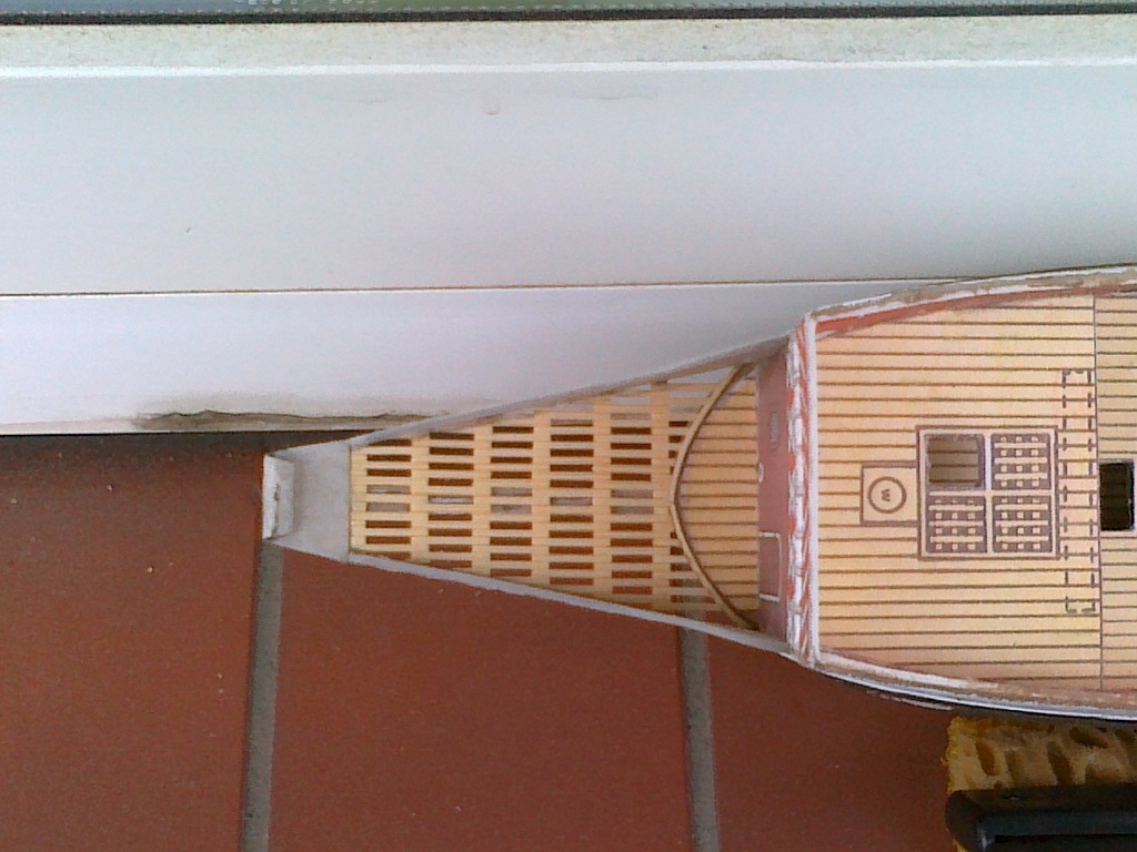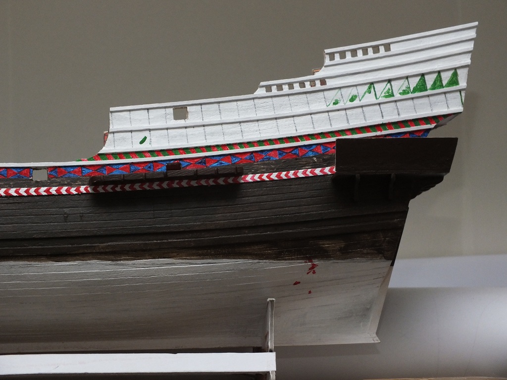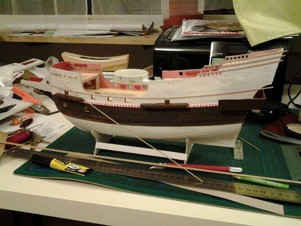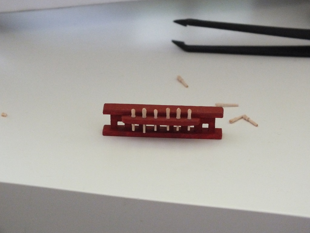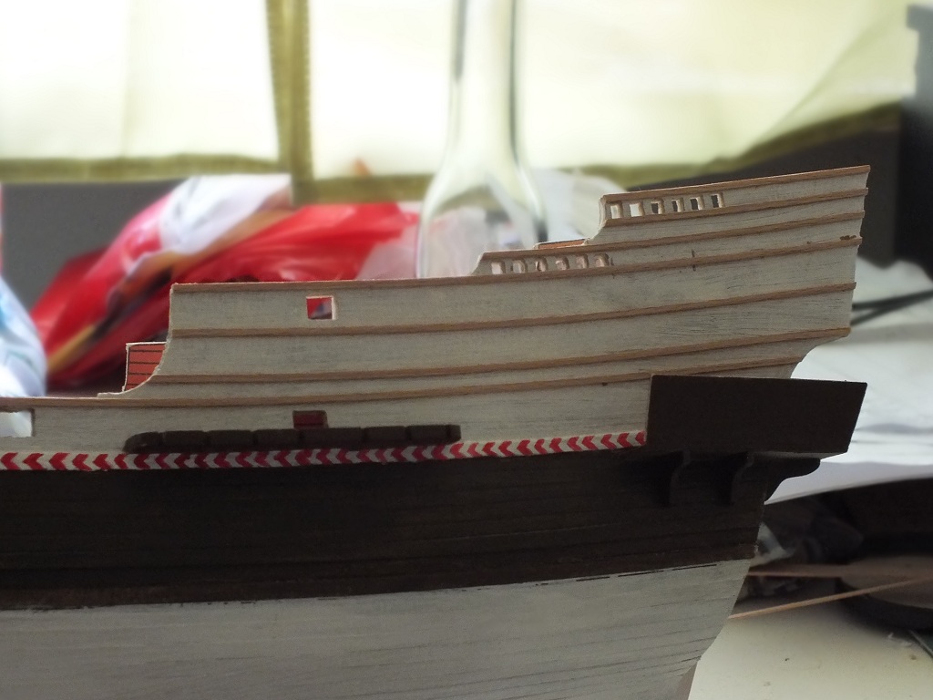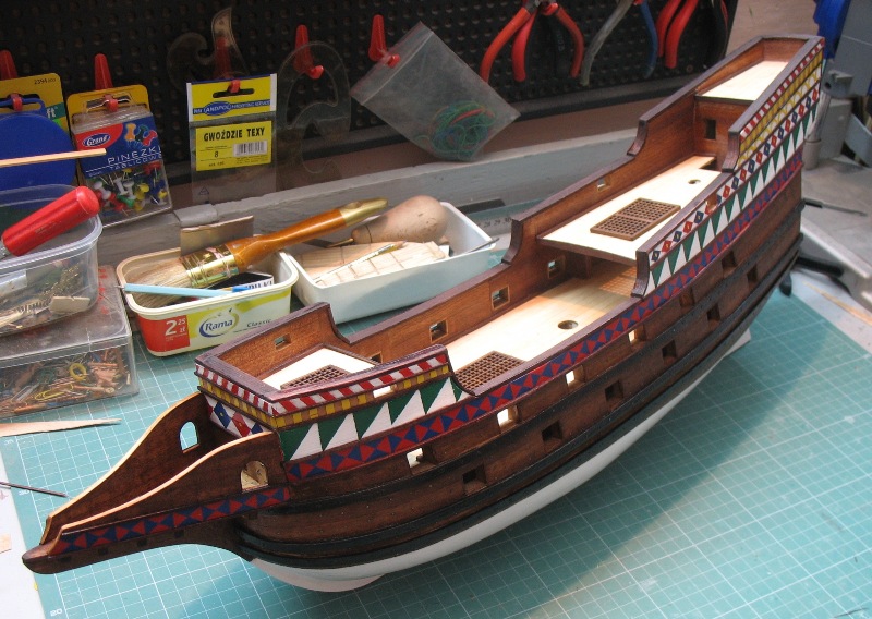 Oprócz kołkownic próbowałem wykonać przy pomocy szlifiereczki, wykałaczek i iglaków pierwsze nagle. Myślę, że jak jeszcze troszkę poćwiczę, to moje nagle będą bardziej powtarzalne. Ławy wantowe grotmasztu i fokmasztu wykonałem z deseczki bukowej 3 mm przy pomocy miniszlifierki i pomalowałem farbami akrylowymi. Rozpocząłem także montaż galeryjki rufowej. Wycinam ją nożem typu skalpel z tektury impregnowanej o gr. 1,5 mm, szlifuję papierem i sklejam przy pomocy kleju cyjanoakrylowego w żelu. Podpory rufowe galeryjki wykonałem z deseczki bukowej, a burtowe z tektury. Galeryjka jest jeszcze nie skończona, gdyż na tym etapie muszę pociągnąć wyżej burt malowanie. Teraz jeszcze jako tako mogę malować, ale gdybym miał kompletną galeryjkę, to miałbym problem z malowaniem. Na modelu pojawia się farba oraz listwy no i tak po troszeczku do przodu.
