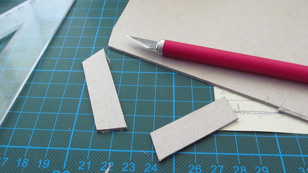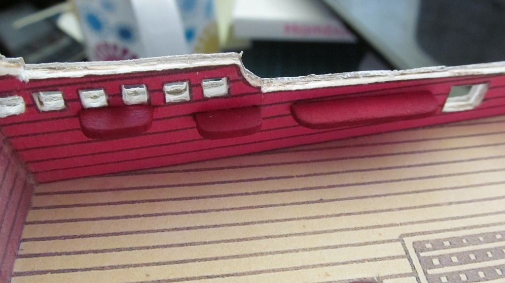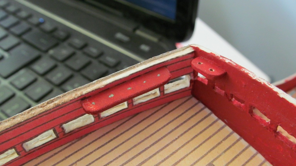 Z tektury grubości 1,2 mm wykonałem większość kołkownic. Wg planów wszystkie mocowane do wewnętrznych części burt. Z zaimpregnowanej tektury, po przeliczeniu i narysowaniu kształtów wyciąłem wszystkie niezbędne elementy. Krawędzie i niedokładności zeszlifowałem papierem ściernym (120 grad). Przed przyklejeniem pomalowałem elementy farbami akrylowymi. Nagielbanki jeszcze nie mają otworów na kołki.