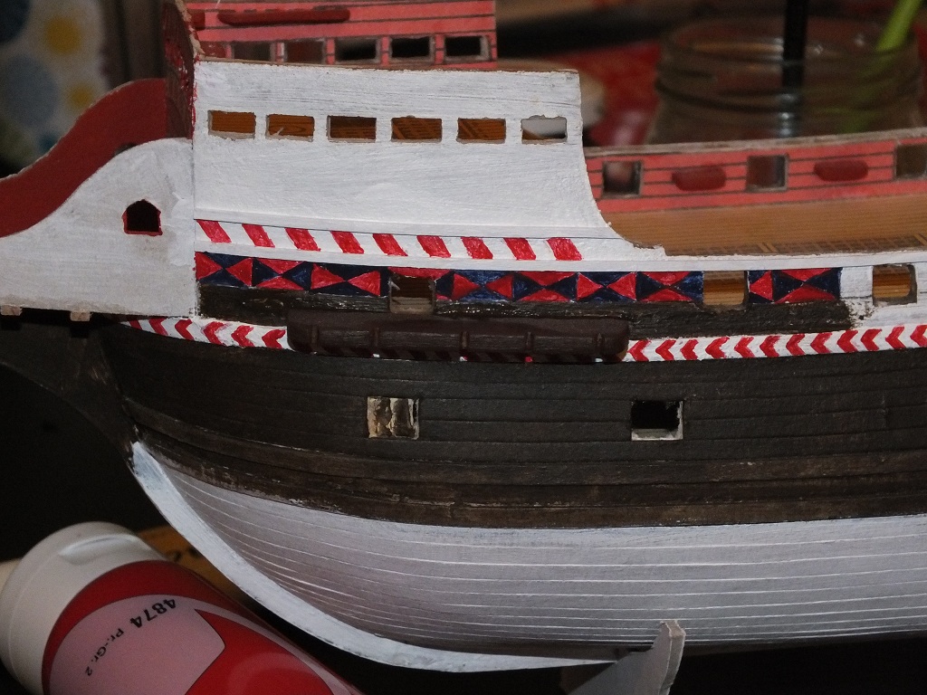 Witaj! wbrew pozorom malowanie nie jest takie trudne tylko ty to trochę dziwnie robisz . Zrobiłeś biały podkład i błąd bo zakryć białą farbę na przykład zieloną lub czerwoną nie jest wcale łatwo i dlaczego nie używasz taśmy maskującej by równe brzegi mieć tych wszystkich trójkątów i pasków . Owszem jest sporo pracy z maskowaniem ale efekt jest dużo lepszy niż to co ci wyszło . Odnoszę wrażenie też że nie przygotowałeś sobie burt do malowania i dlatego biała farba dość mocno ci wsiąkła i jest nierówna i prześwituje a chcąc uzyskać dobrą biel trzeba dać kilka warstw. Przed malowaniem należało zabezpieczyć na przykład kaponem lub lakierem podkładowym bezbarwnym by farba nie wsiąkała i równo się rozprowadzała a także zabezpieczenie takie pozawala bardzo dobrze maskować taśmą bo ma ona dobrą powierzchnię do przyklejenia . Ja tak robiłem w swojej Złotej Łani zajrzyj tam i pooglądaj jedno zdjęcie załączam. Ten sposób malowania jest dobry zarówno na drewnie jak i na tekturze wszystko musi być odpowiednie przygotowane do malowania