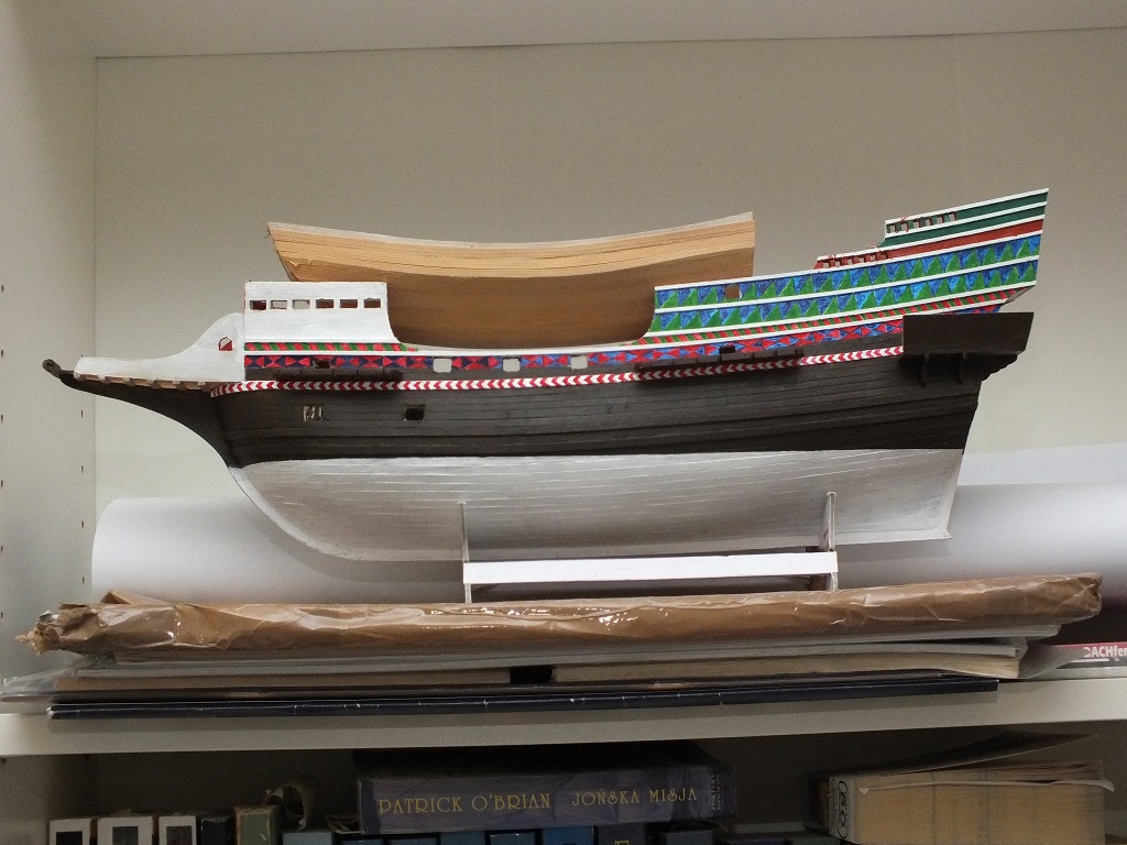 Zrobiłem listwy na burtach i pomalowałem. Nie napisałem wcześniej ale listwy wykonałem z listewki bukowej tnąc ją wzdłuż na pilarce proxxona KS230. Listewki maja wymiar 1,9 mm na 1 mm. Miejscami pilarka "obskubała" listewki więc myślę, że buk nie był najszczęśliwszym wyborem. Niemniej wykorzystałem dobre kawałki. Po naklejeniu listew - malowanie. Jeśli chodzi o dalszy etap, to myślę, że po pomalowaniu kadłuba zrobię wzmocnienia burt na śródokręciu i furty działowe, a następnie skończę balkonik i przejdę na pokład lub zrobię ster.