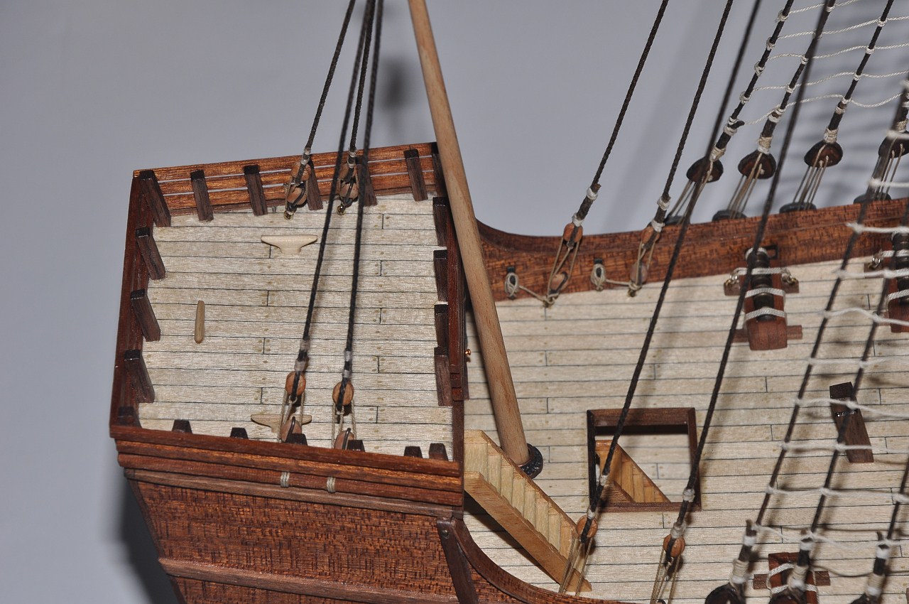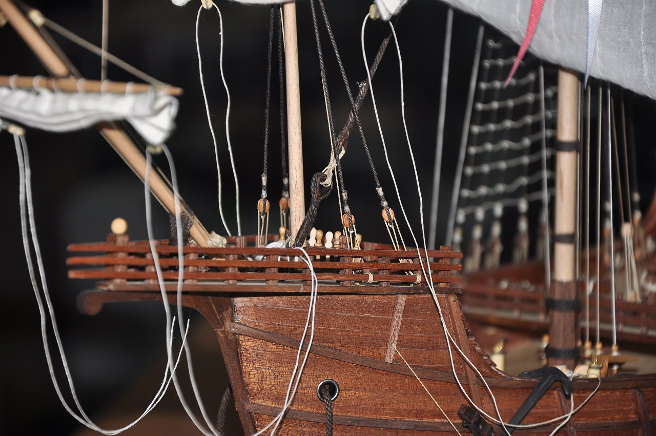 przypuszczam że bloczek (1) który jest zamocowany do pokładu i linka z prawej strony wisząca to wanty