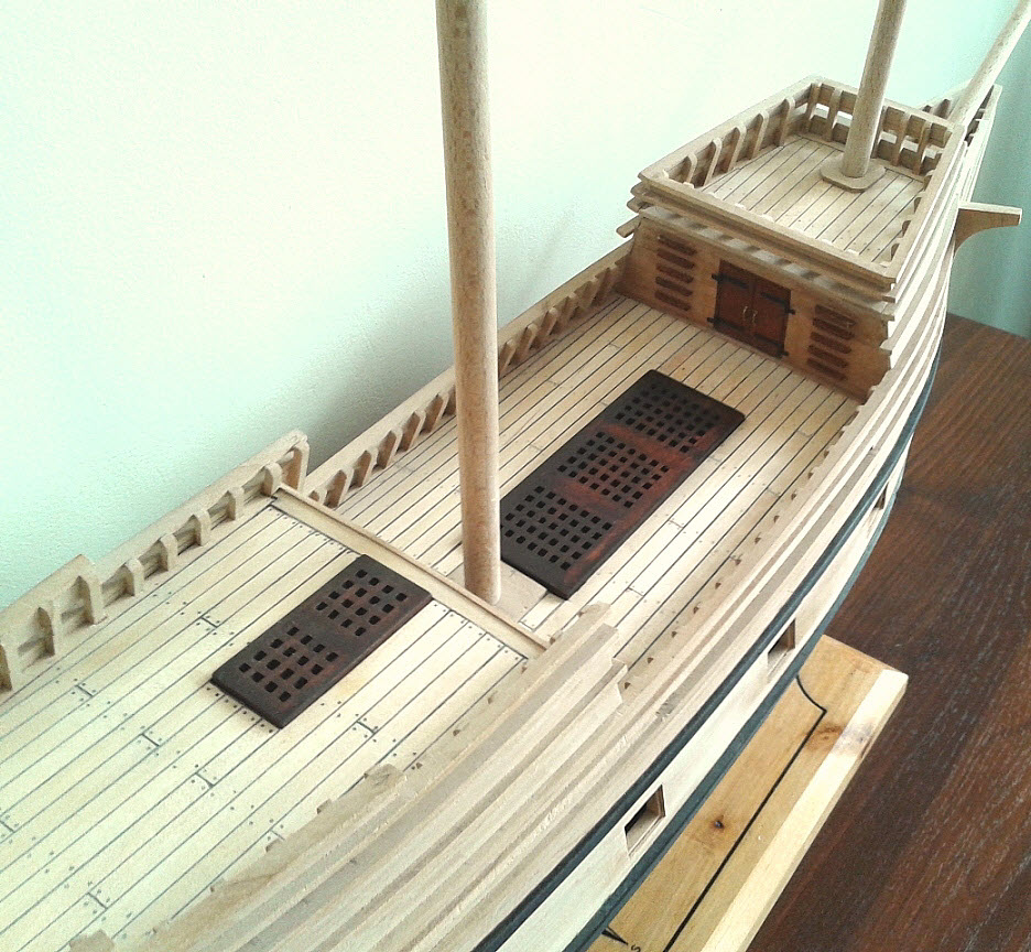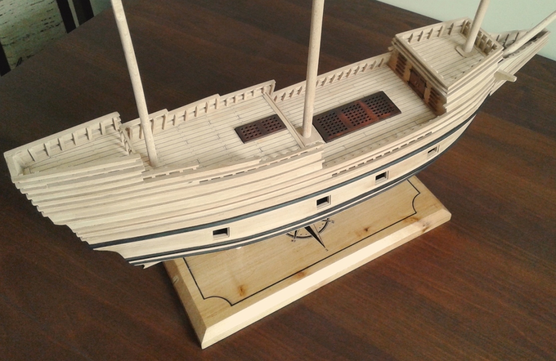 I wytoczyłem na wiertarce mosiężne stopki, a cała filozofia mocowania modelu do podstawy polega na tym że od spodu "idzie" długi wkręt przez otwór podstawie i stopkach, po czym przez otwór w kilu i dopiero wchodzi ciasno w sklejke kadłuba (trzeba wywiercić odpowiedni otwór w sklejce aby wkręt nie powodował jej rozwarstwienia tylko dobrze trzymał)