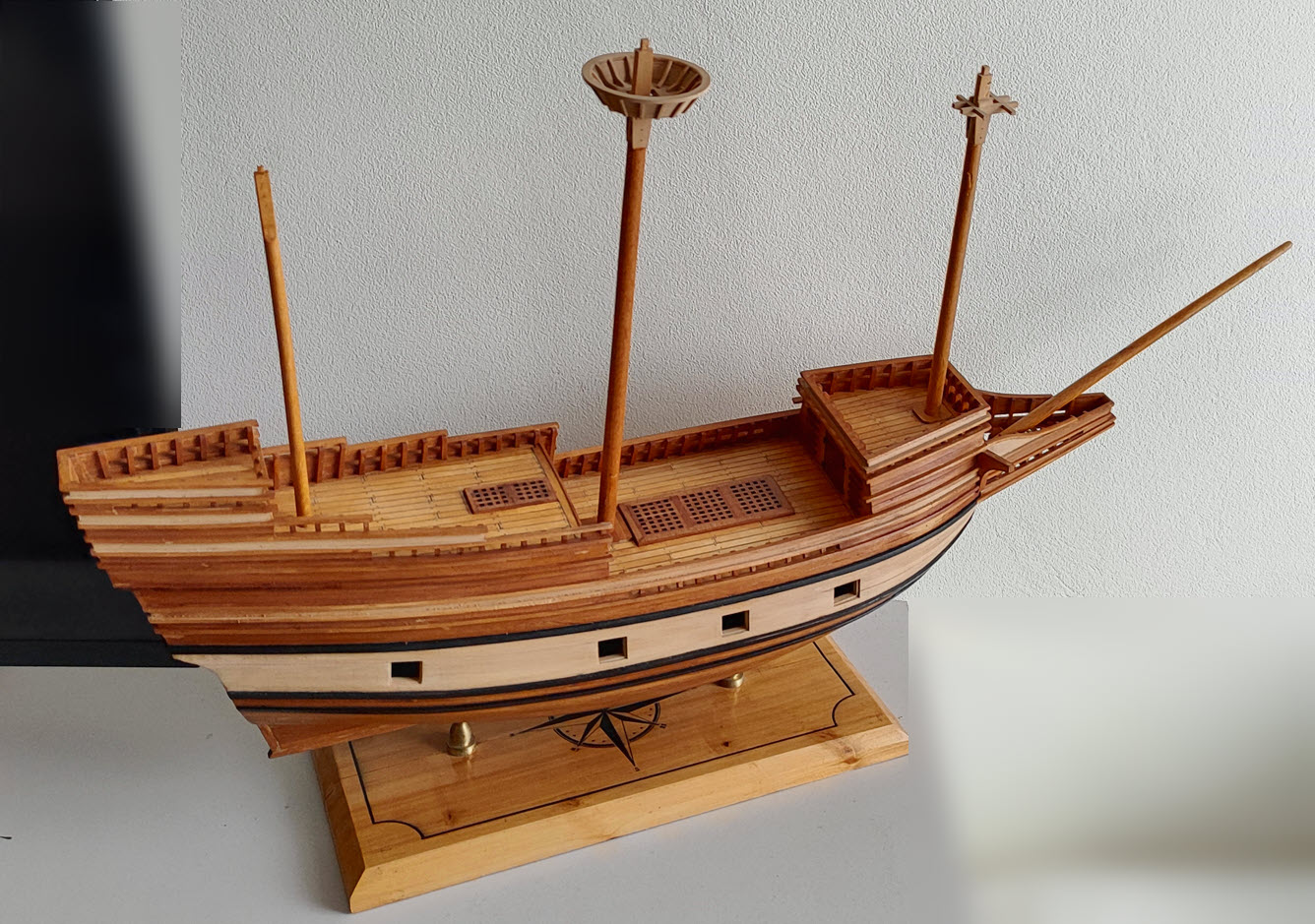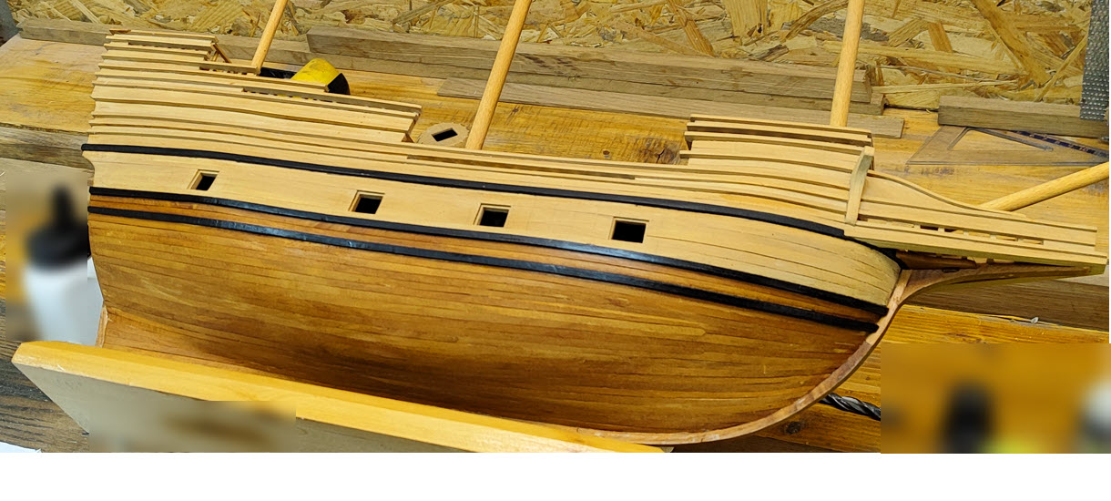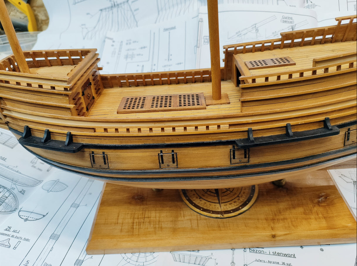 Jeśli chodzi o ułożenie listewek marsów wzdłuż tworzących stożka, to ja sobie ułatwiłem wykonując stożki obu marsów z kartonu o kolorze zbliżonym do koloru drewna, a kształtowe listewki poprzyklajałem przykładając pierścienie do rysunku z planów.