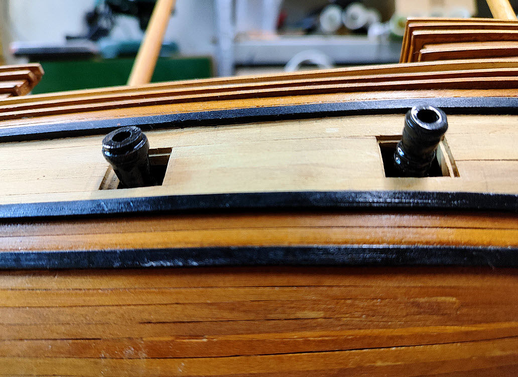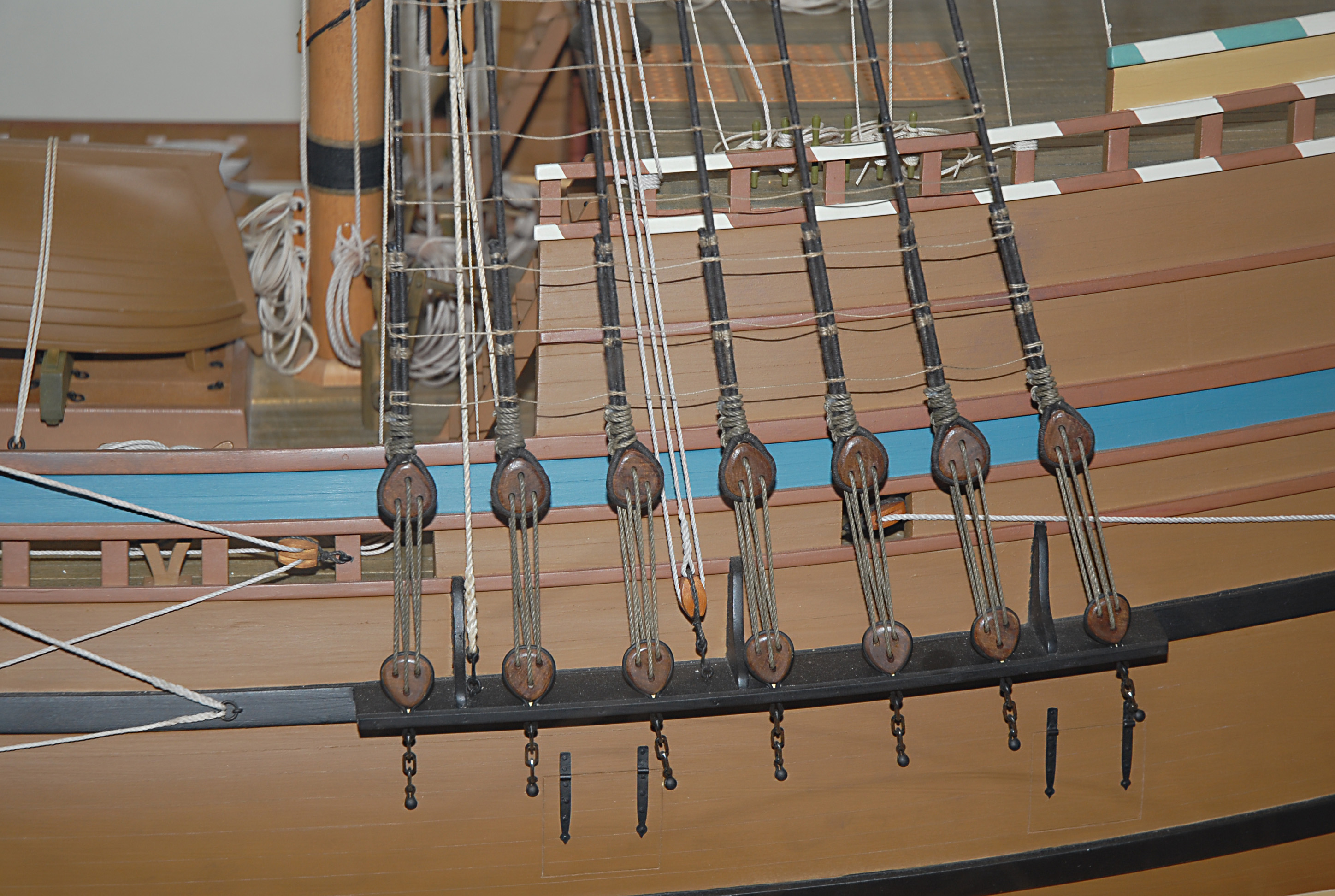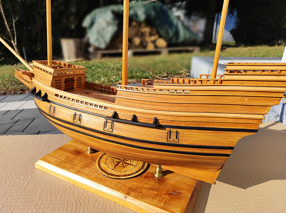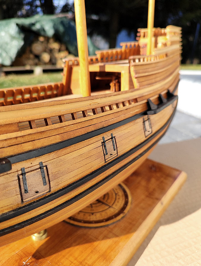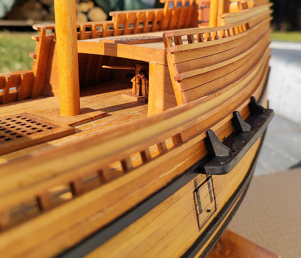 Przybyły kolejne elementy na jednej z burt – jak gunporty z zawiasami, belki do mocowania want (nie udało mi się znaleźć fachowych nazw), odświeżony/rozjaśniony kabestan, zamocowany emblemat itd…