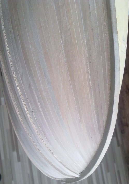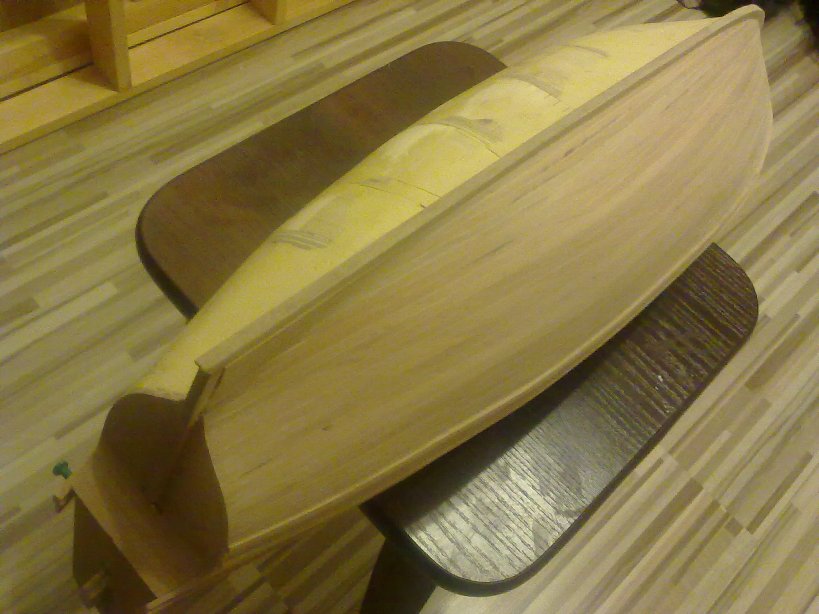 Pomału kończe pierwszą stronę poszycia - idzie to topornie ale jakoś idzie (taki już urok jesli się chce wszystko samemu wykonać - chodzi oczywiście o materiał źródłowy). Ciemne planki na fotkach to przypalenia po frezie - ale schodzą gładko pod papierem.
