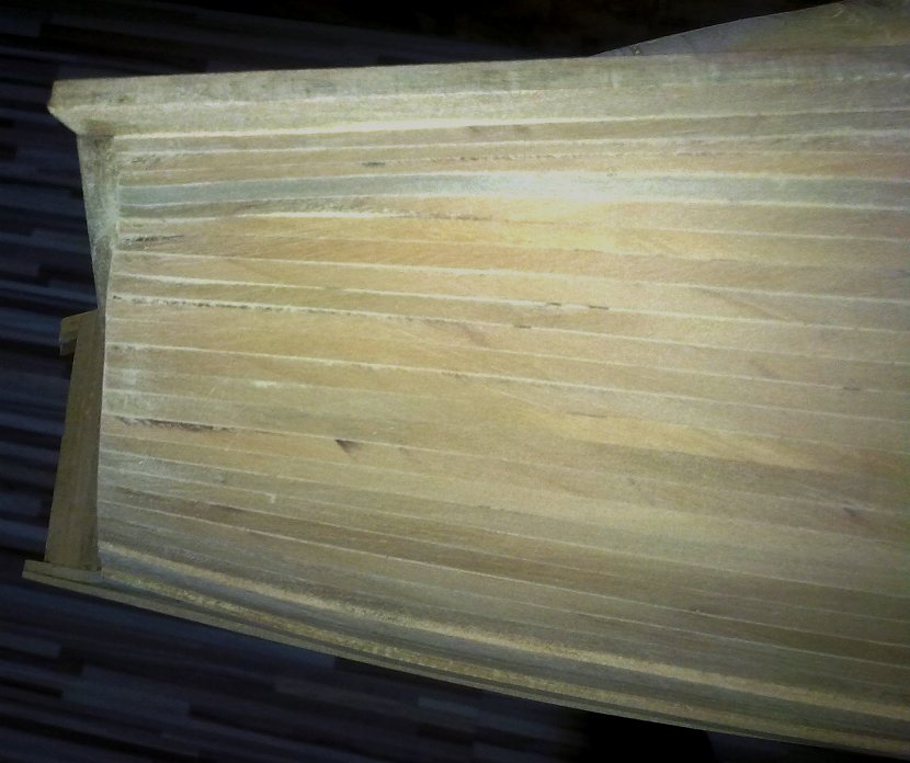 Dokończyłem spód i przeszlifowałem zgrubnie - pierwsze grubym papierem (listewki lekko zmoczone wodą - pewnie lepszy byłby lakier lub kapon - bo woda nie klei trocin natomiast podczas szlifowania trociny wypełniają szpary - i pasowałoby, żeby już tam zostały ;) - woda tego nie zapewni a jakiś lakier/kapon pewnie tak). Troche też zostało przecyklinowane ale jeszcze nie na gotowo, przypalenia od freza prawie całkowicie zniknęły: