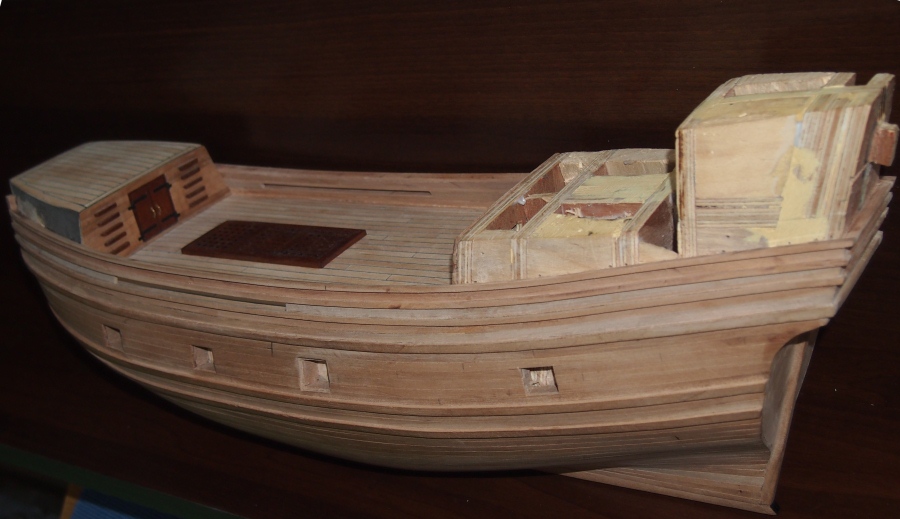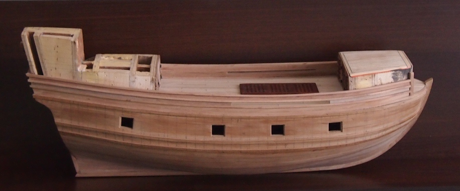 Na pierwszy ogień pokład kasztelu plus przymiarka dziobu z tektury, który w przyszłości zastąpi gruszka (przy okazji polecam wszystkim, szczególnie początkującym, którzy mają jakiekolwiek wątpliwości co do tego jak coś zrobić (np. plany nie mówią jasno wszystkiego lub czegoś nie rozumiemy do końca) wykonanie próbek z papieru, kartonu czy tektury - jeśli coś zepsujemy nic nie tracimy - a szkoda psuć drewna na darmo)