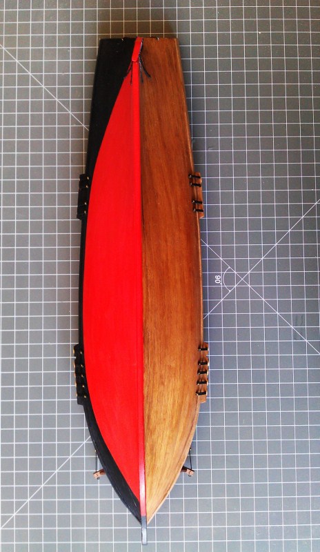 Kadłub statku jest po sterburcie pokryty lakierem, natomiast na bakburcie jest odtworzone malowanie statku.
