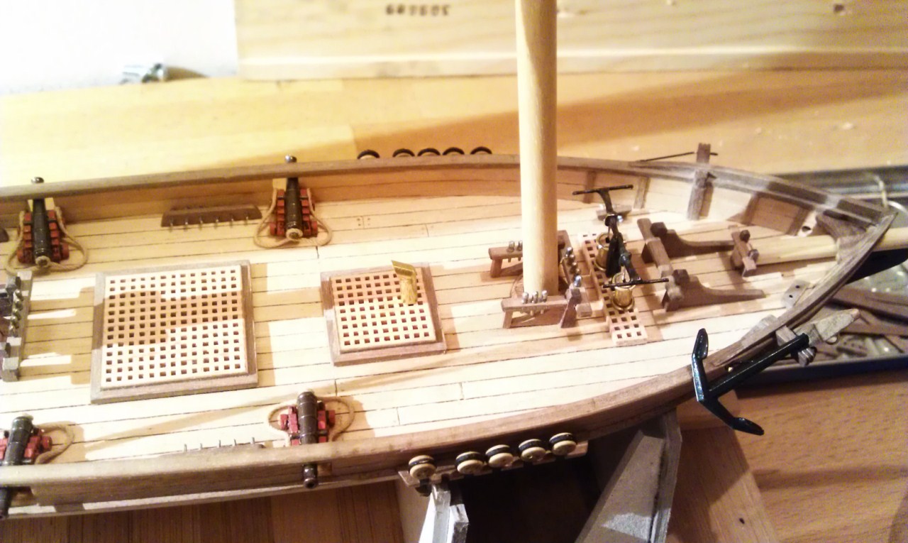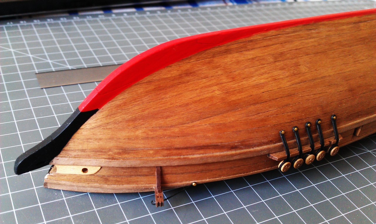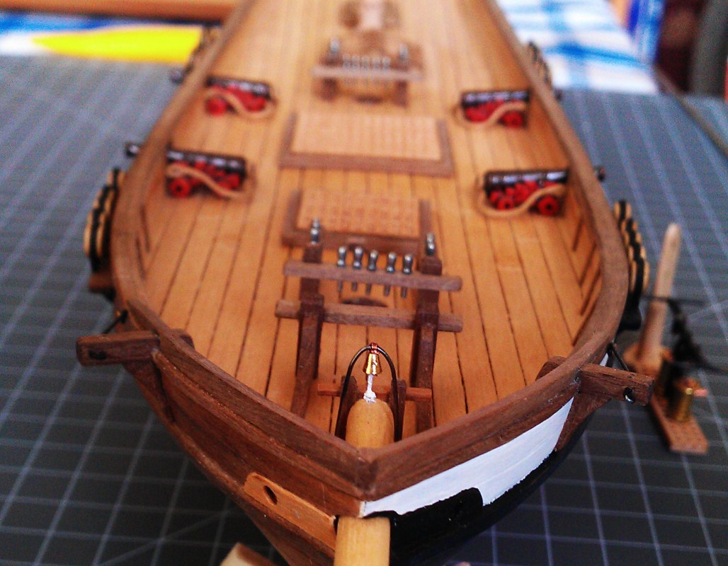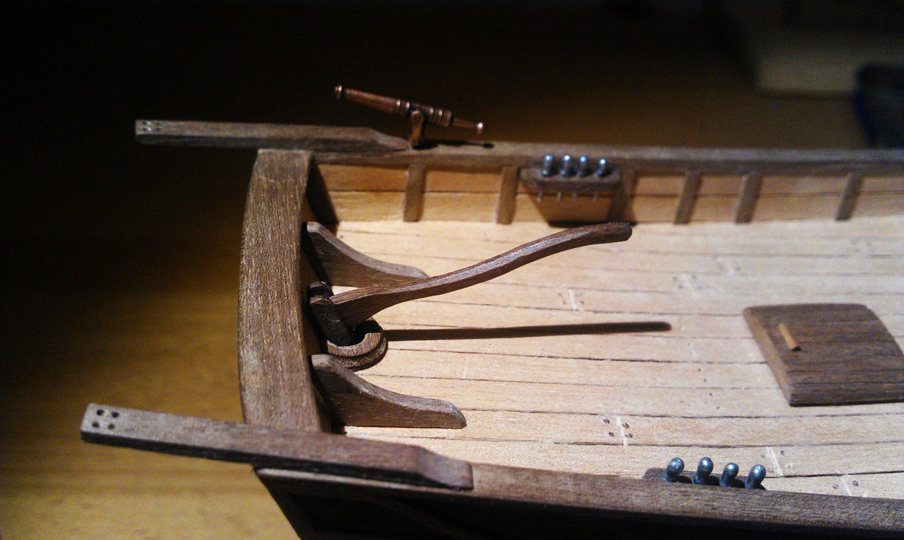 na dziobie przybyły knagi, okucia kausz lin kotwicznych, otwory lin idących na bukszpryt.