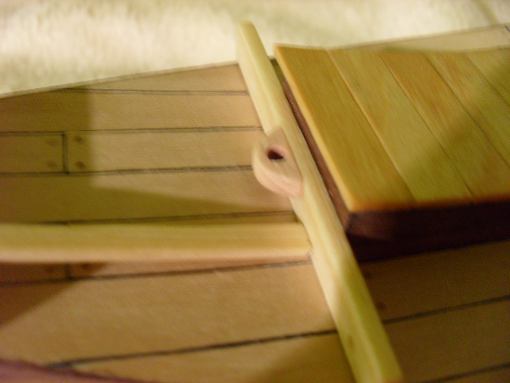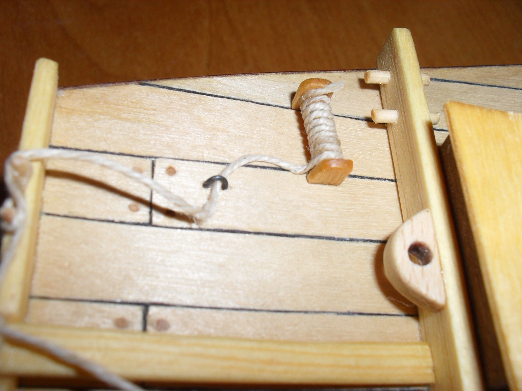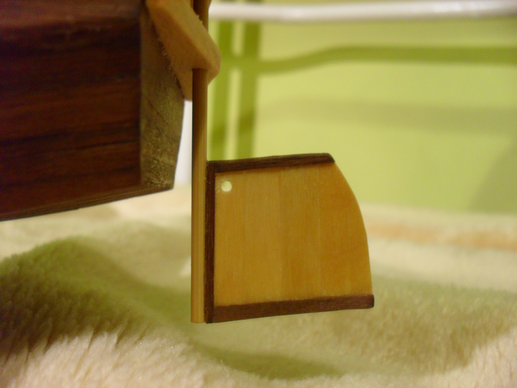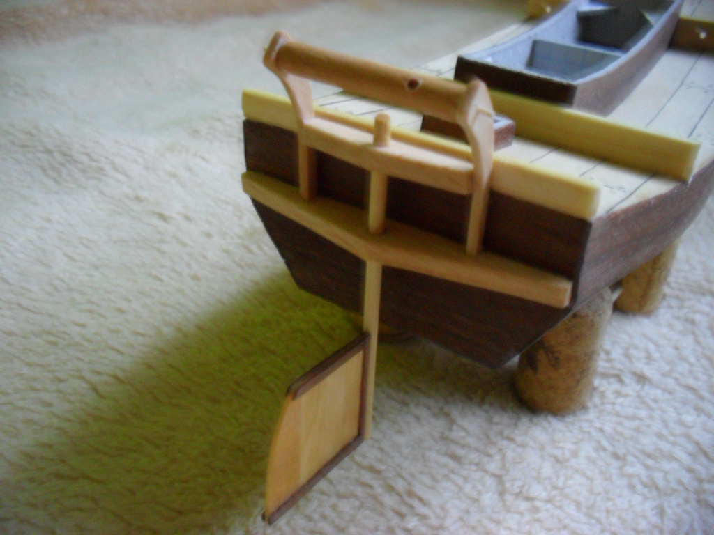. Jak na razie kolejne elementy przybywają na model , pojawiło się mocowanie steru oraz 4 listewki przyklejone do pokładu. Ster jest włożony na sucho.