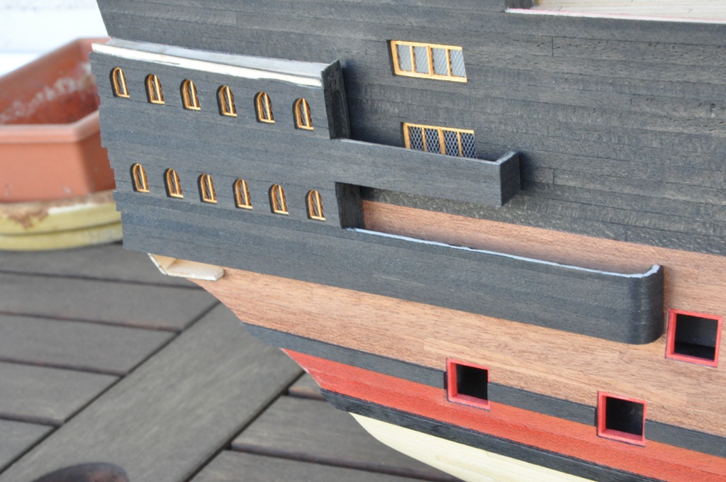 dzisiaj w zasadzie nie ma się czym chwalić, tak tego jest niewiele (chroniczny brak czasu), ale lewa burta skończona i można by tu przystąpić do wykonywania galeryjek rufowych (niektóre krawędzie będą jeszcze docięte po wykonaniu ścianek na pokładach)