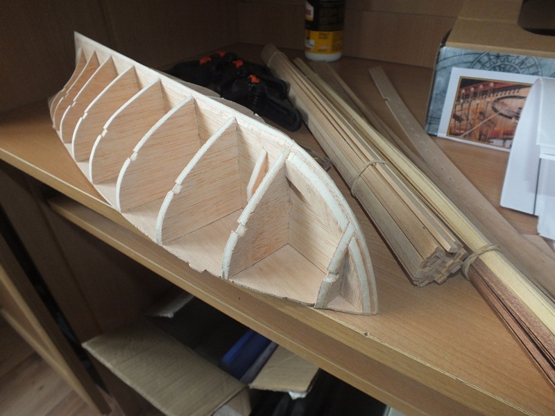 Niestety ale nie robiłem zdjęć na samym początku budowy, na poniższych zdjęciach jest już gotowy sklejony szkielet kadłuba oraz przyklejony pokład. Wręgi oraz wzmocnienia doszlifowałem pod odpowiednim kątem tak aby listewki poszycia dokładnie przylegały do krawędzi wręg i wzmocnień.