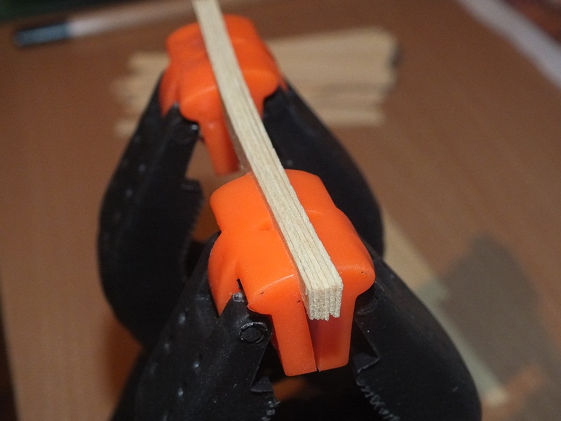 Dziurki na kołki wierciłem igłą za pomocą multiszlifierki w stylu Dreamelka, wysokie obroty i igła powodowały przypalenie powierzchni bocznych dziurek, dzięki czemu nie musiałem czernić końcówek wykałaczek...