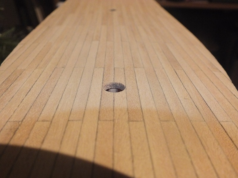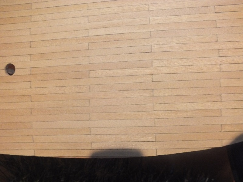 Następnie dociąłem i przygotowałem deseczki na deskowanie pokładu. Instrukcja wydawnictwa pokazuje, aby przyklejać całe długie listewki na całej szerokości pokładu (smołowanie i kołkowanie za pomocą ołówka na poszytym już pokładzie), osobiście mi się to wcale nie podobało...