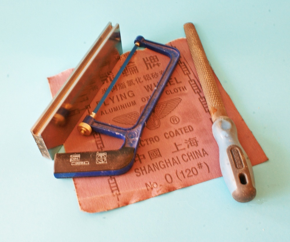 Jak na razie to co na fotce zupełnie mi wystarcza. Ta stalowa płytka z rowkiem, służyć będzie do szlifowania listewek z obłogu, na pożądany wymiar. W tym wypadku 7 mm. Do tego jeszcze nożyk OLAFA, "pilniczki" wykonane z listewki z naklejonym na nią papierem ściernym. Wystarcza za Proxxona i Dremela.