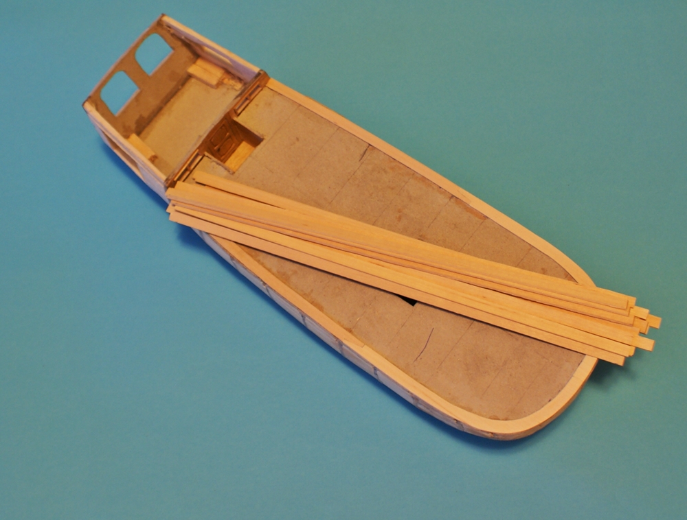 Oczywiście łatwiej było by kłaść pokład z desek o długości pokładu, ale zrobię to tak jak Mati w swoim modelu. W moim modelu, pokład od ścianki nadbudówki rufowej, do dziobu, ma 306 mm długości, tak że jest dość miejsca aby wykonać pokład z przesunięciem planek.
