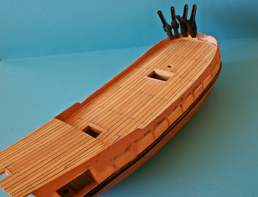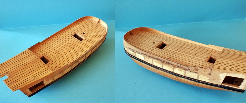 Pokład leży na wręgach i układa się wg ich położenia. Z odbojnicą wszystko w porządku, to tylko przetarcia tuszu na drewienku, które później znikną